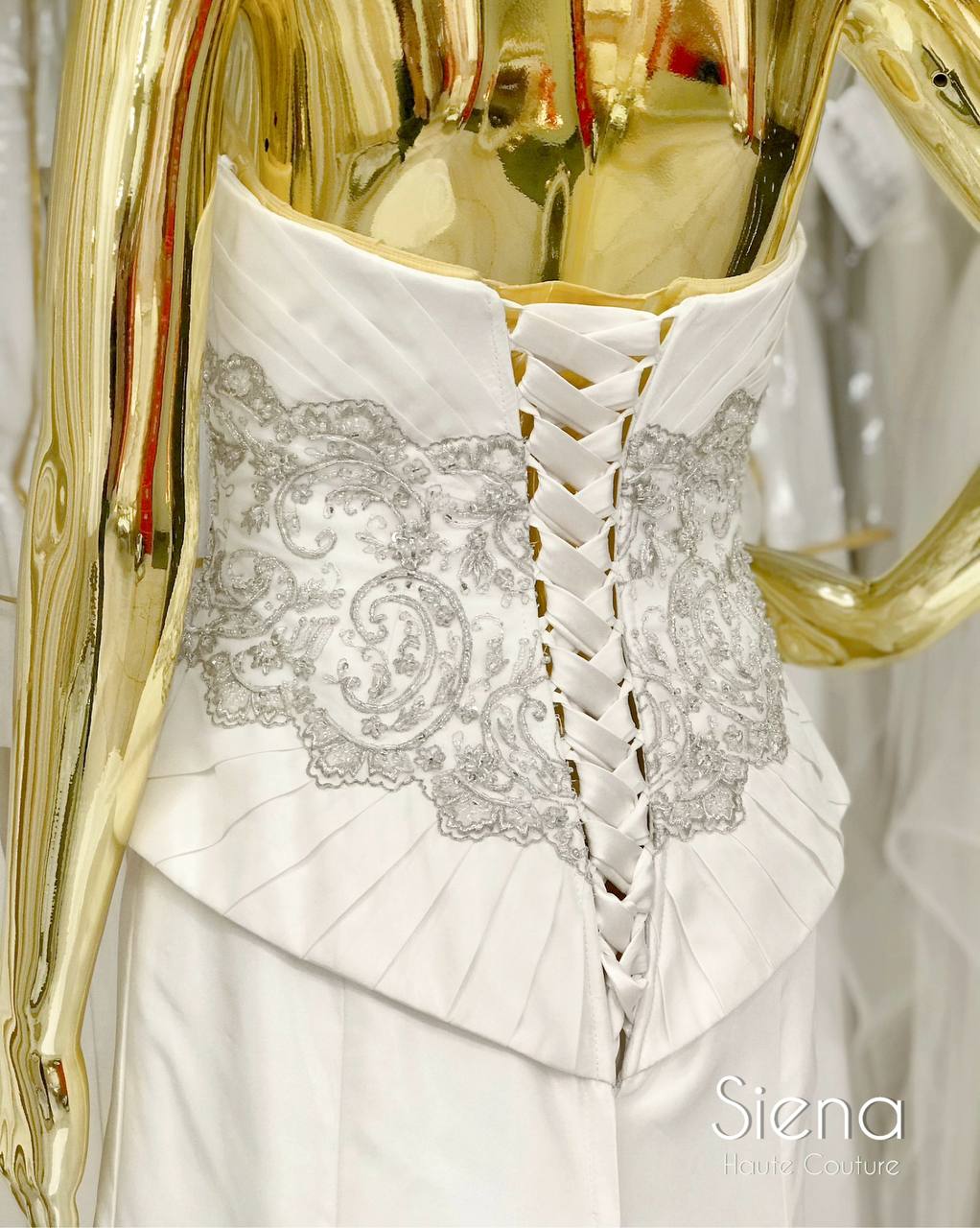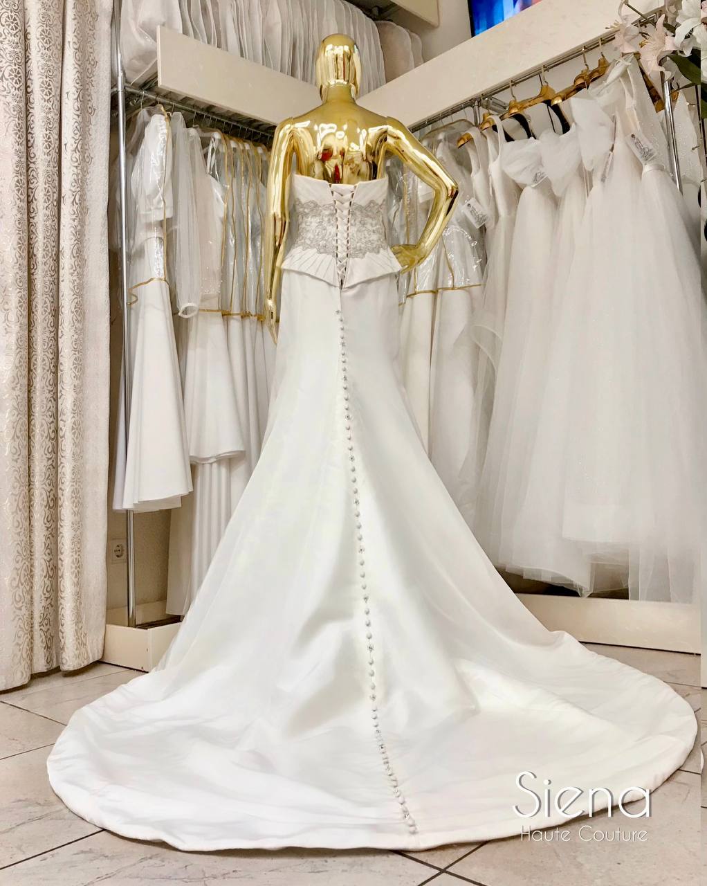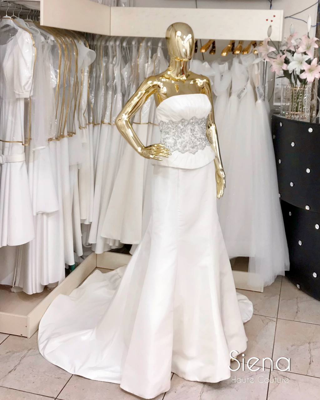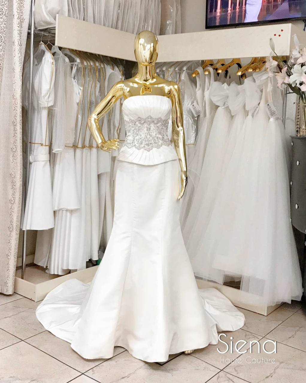 Чарівна краса в кожній деталі! Наша неповторна модель «Siena» силуету, що облягає, виконана з французького тафетасу не залишить байдужою жодну наречену. Чарівний шлейф додає величності, а корсетний пояс зітканий руками Кутюр'є з кришталю та кристалів «Swarovski» створить неповторний образ. Відкрийте для себе винятковий стиль у свій особливий день.