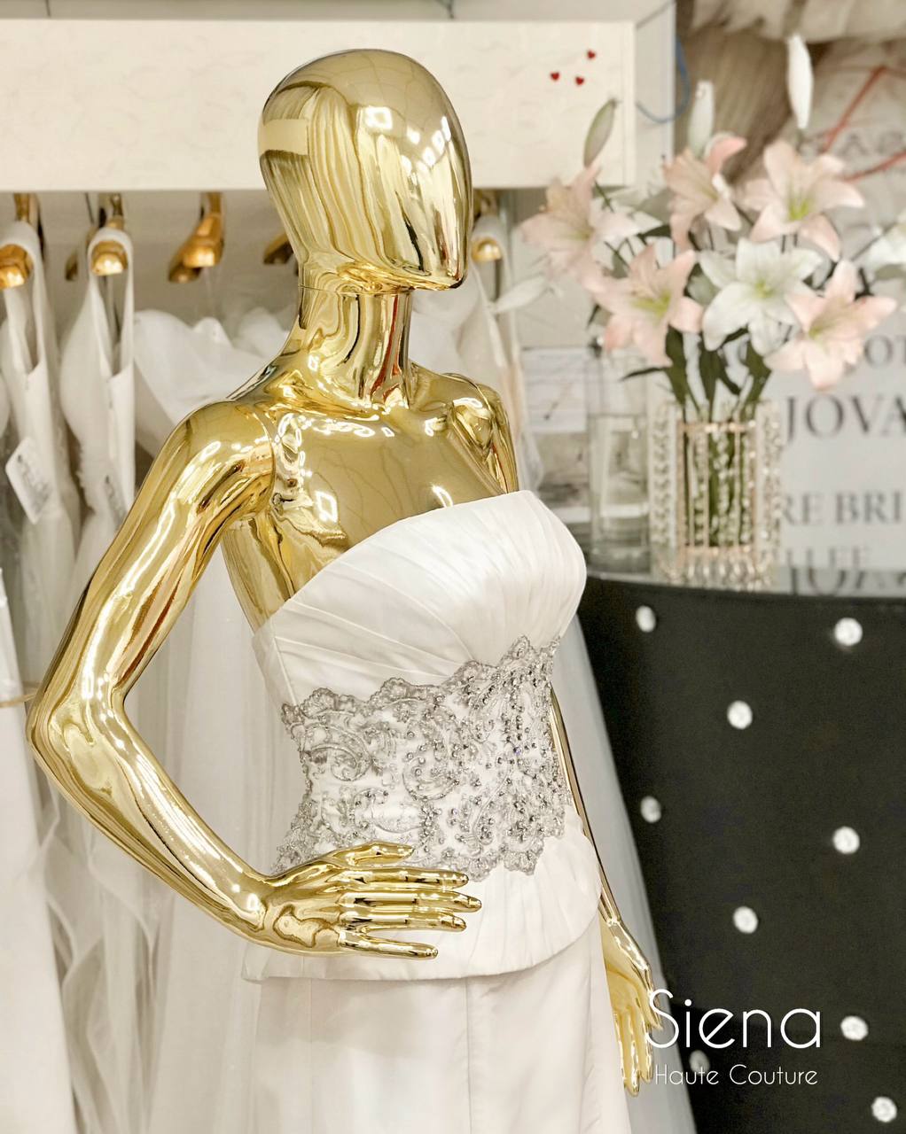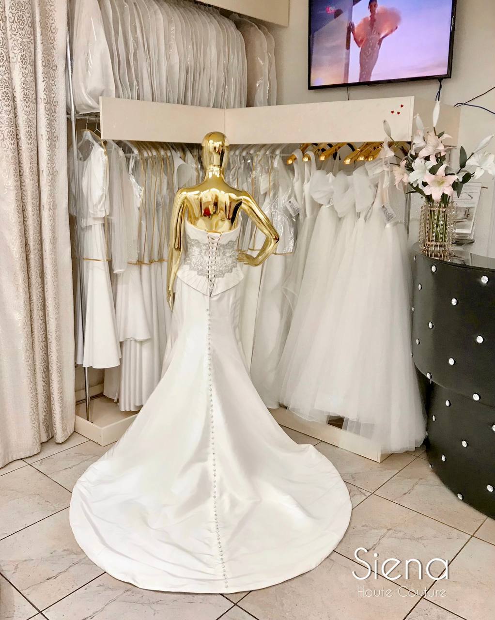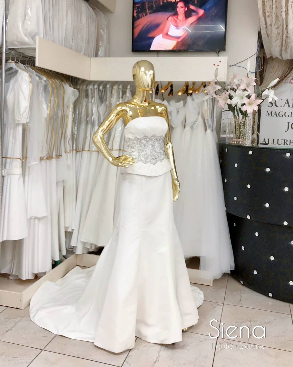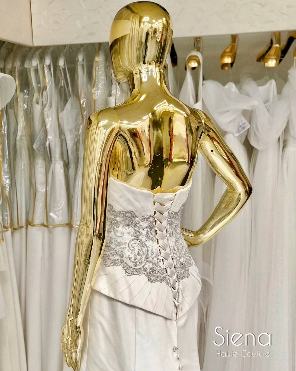 Чарівна краса в кожній деталі! Наша неповторна модель «Siena» силуету, що облягає, виконана з французького тафетасу не залишить байдужою жодну наречену. Чарівний шлейф додає величності, а корсетний пояс зітканий руками Кутюр'є з кришталю та кристалів «Swarovski» створить неповторний образ. Відкрийте для себе винятковий стиль у свій особливий день.
