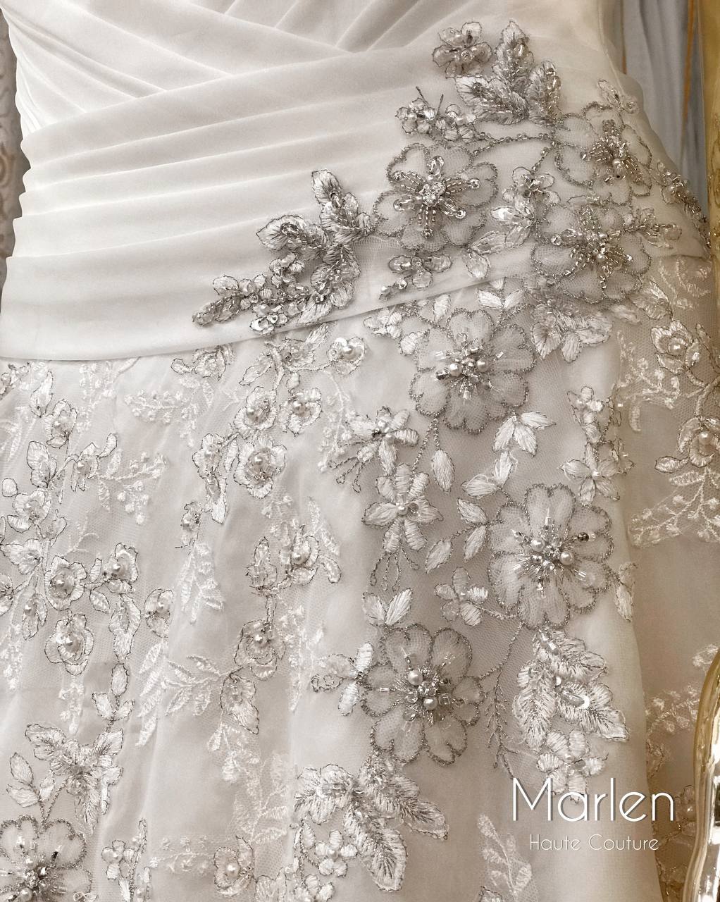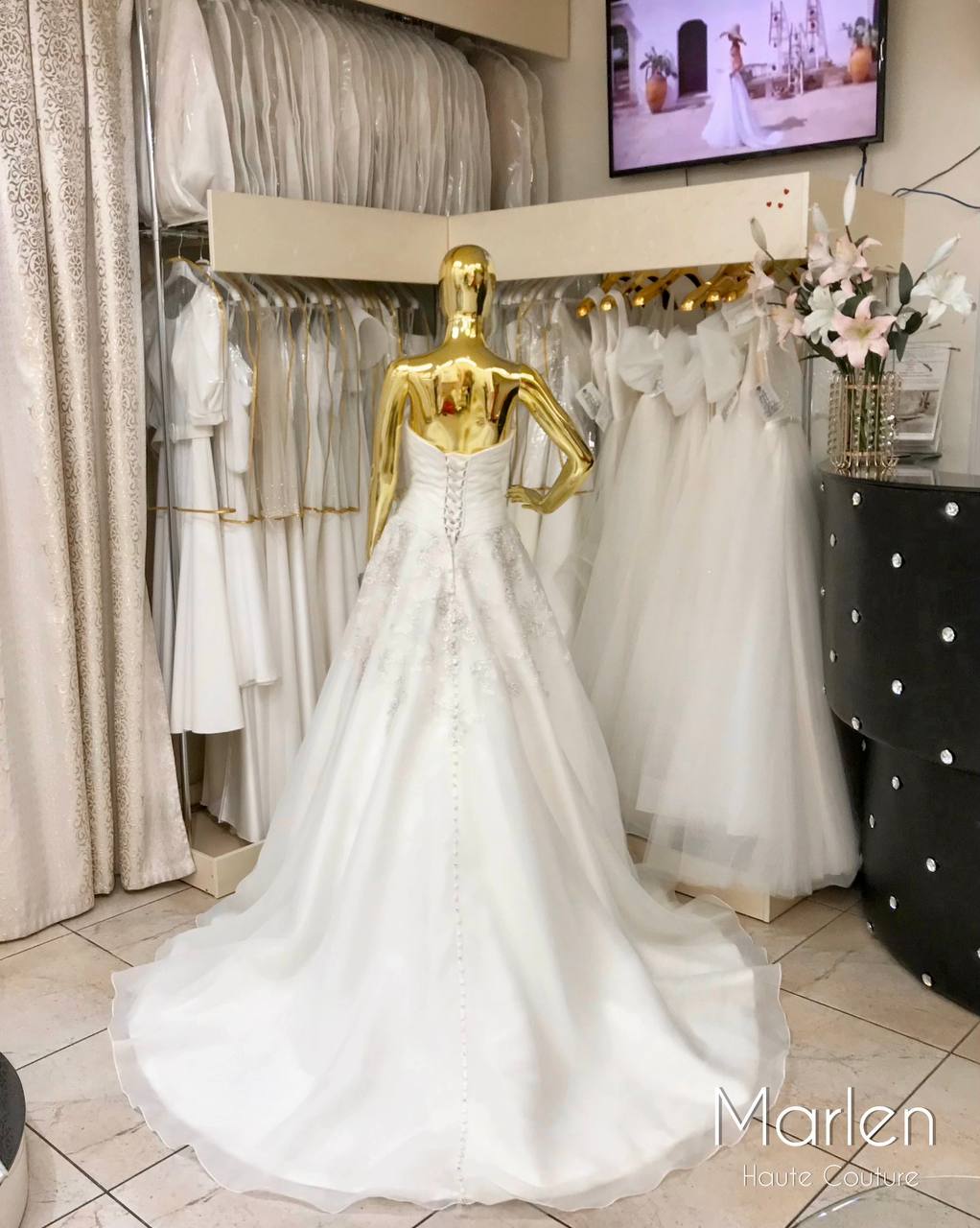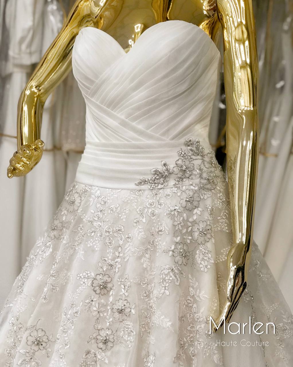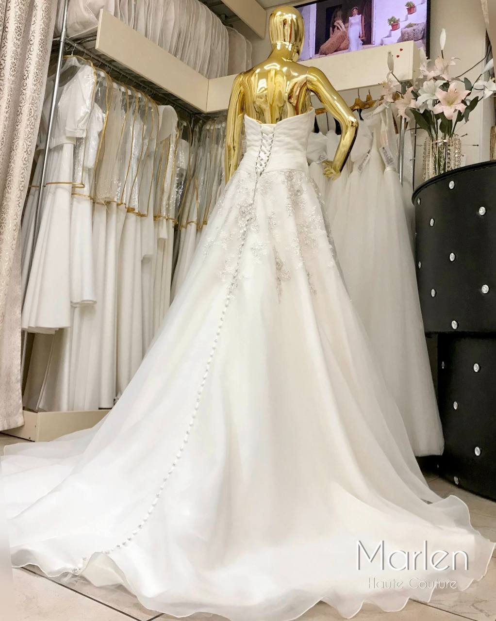 Краса в кожному кроці! Розкішна весільна сукня «Marlen» від всесвітньо відомого бренду надасть своїй обраниці небесну легкість і вишуканість. Пишна спідниця з органзи, легкий шлейф і венеціанська квіткова вишивка срібною ниткою створять чудовий образ, в якому втілиться мрія про казкове весілля.