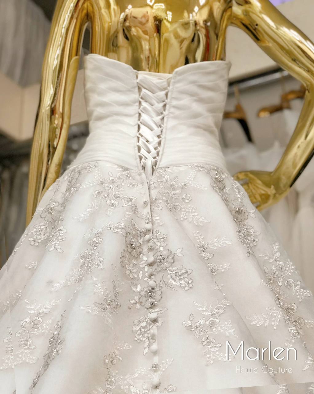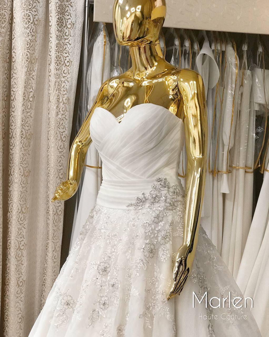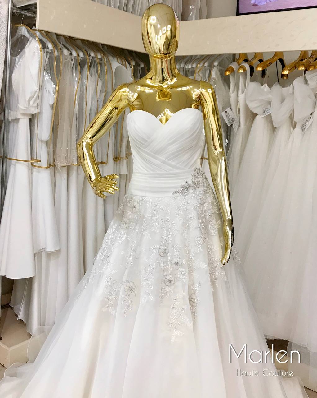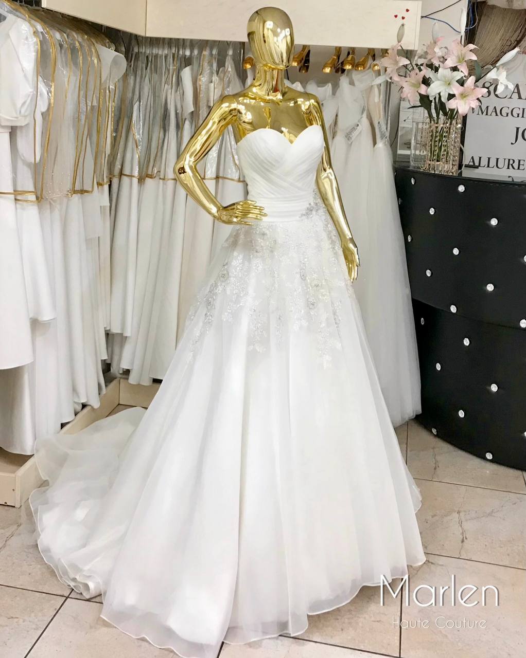 Краса в кожному кроці! Розкішна весільна сукня «Marlen» від всесвітньо відомого бренду надасть своїй обраниці небесну легкість і вишуканість. Пишна спідниця з органзи, легкий шлейф і венеціанська квіткова вишивка срібною ниткою створять чудовий образ, в якому втілиться мрія про казкове весілля.