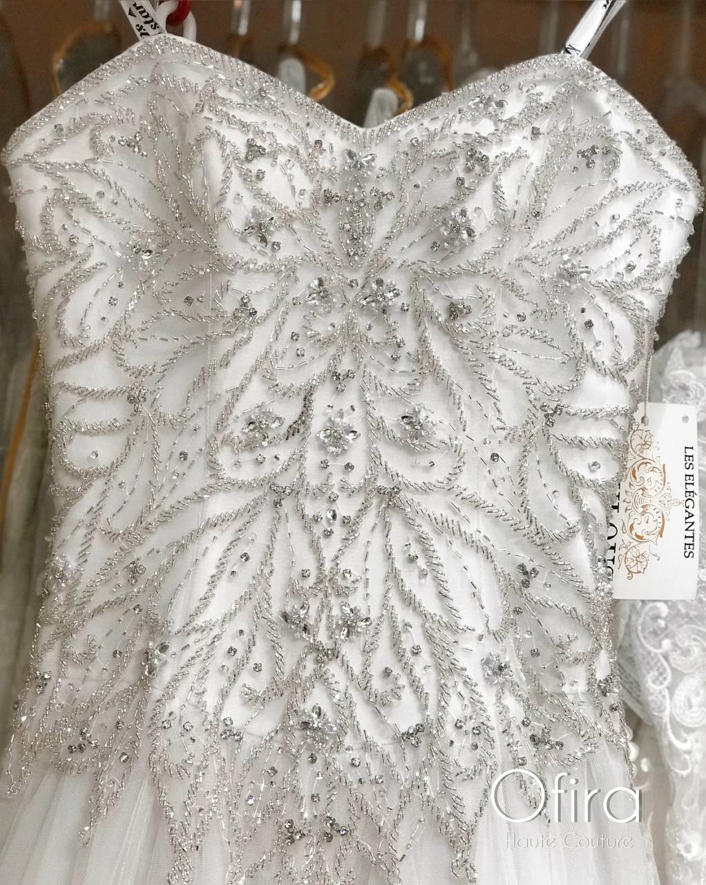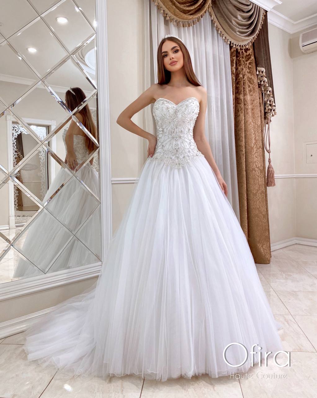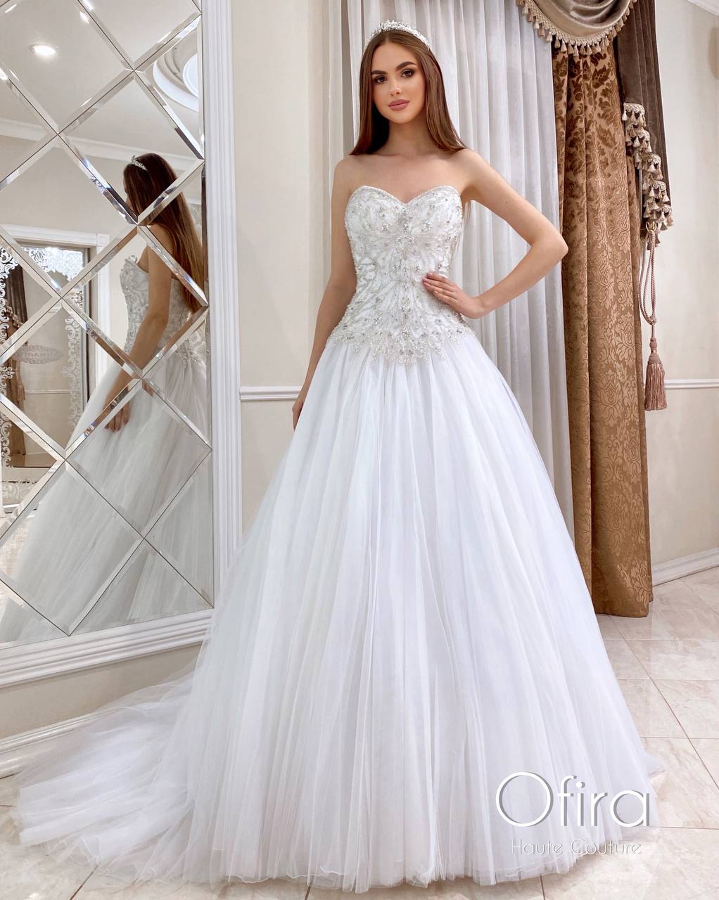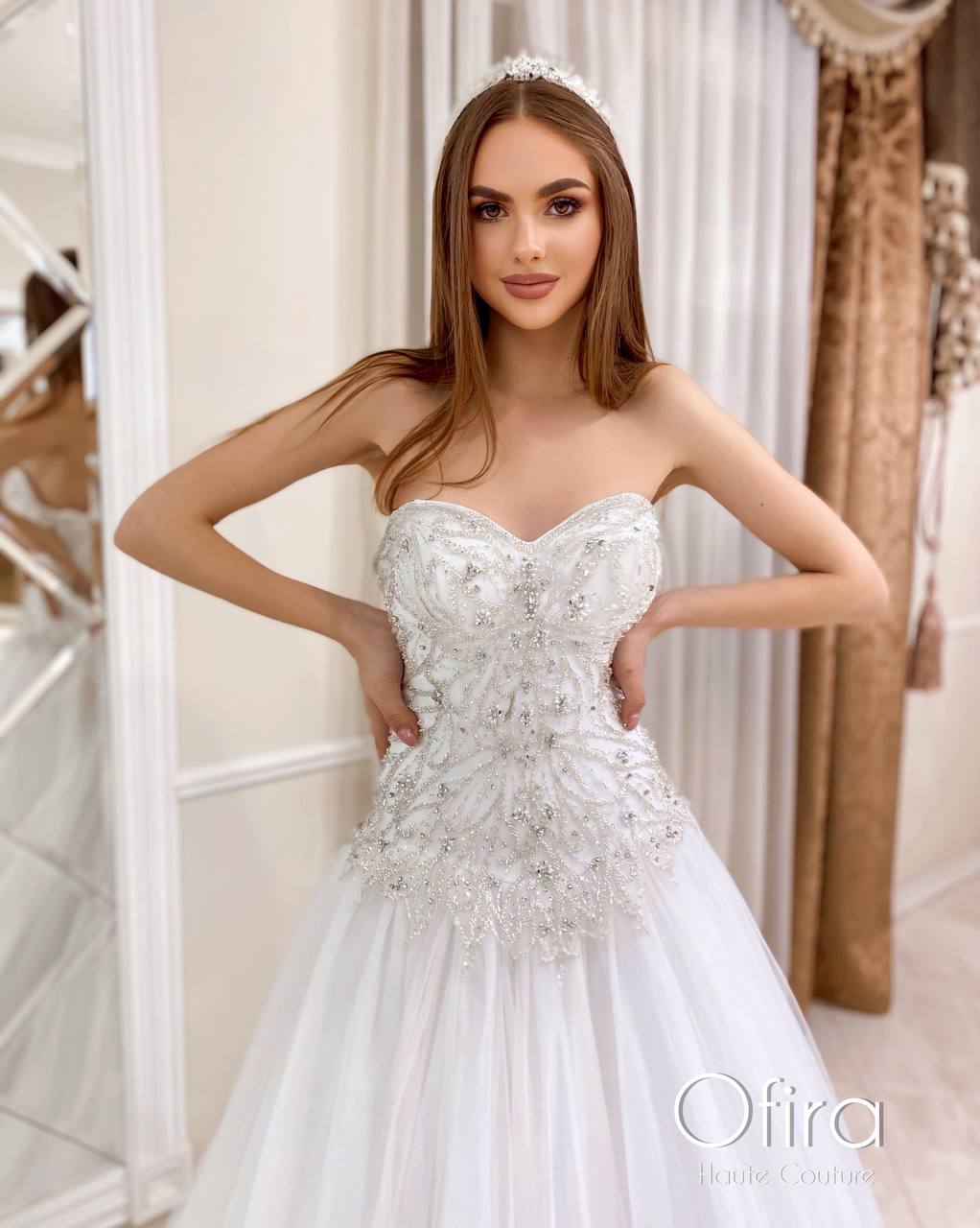Вишукана розкіш та блиск кристалів! Брендова весільна сукня «Ofira» з корсетом, прикрашеним розкішною вишивкою із кришталя та кристалів «Swarovski», створить неповторний образ, де кожен кристал — мерехтіння вашої любові та щастя.