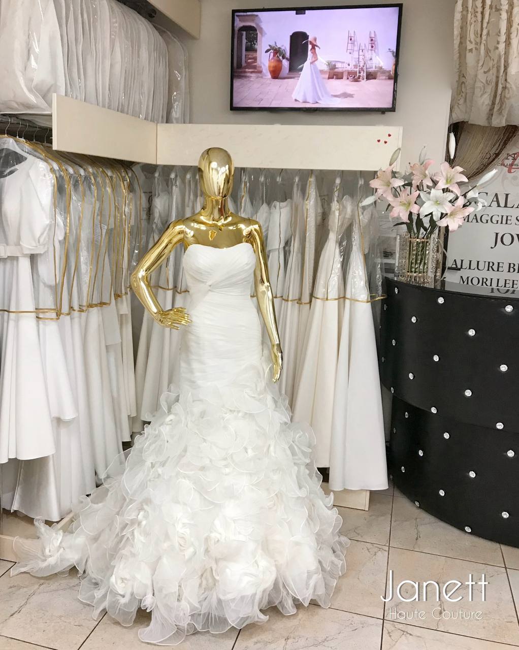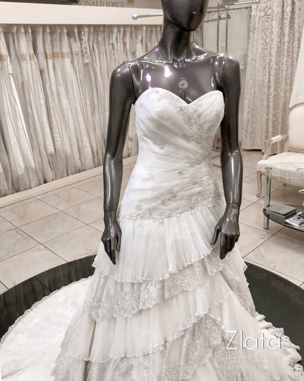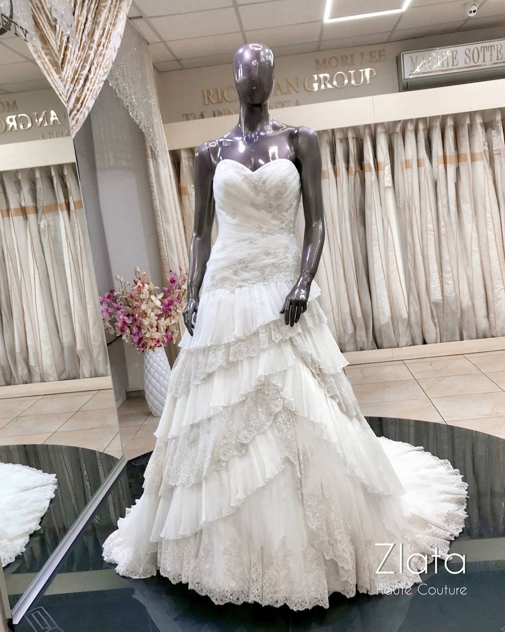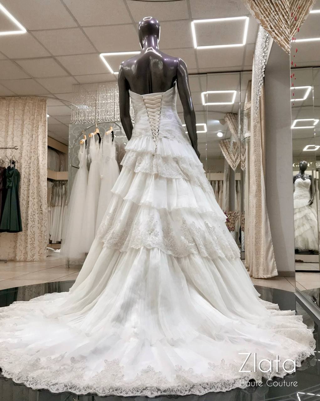 Велична елегантність у кожній деталі! Наша розкішна весільна сукня від всесвітньо відомого бренду «Allure Couture» з королівським шлейфом і вишуканими воланами з плісування та венеціанського мережива з платиновою ниткою — це ідеальний вибір для тих, хто мріє про неповторний образ. Підкресліть свою витонченість і станьте справжньою королевою в цьому чудовому вбранні, яке додасть у ваш весільний день розкоші та величі.