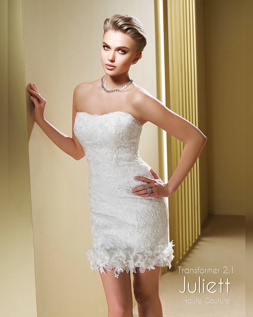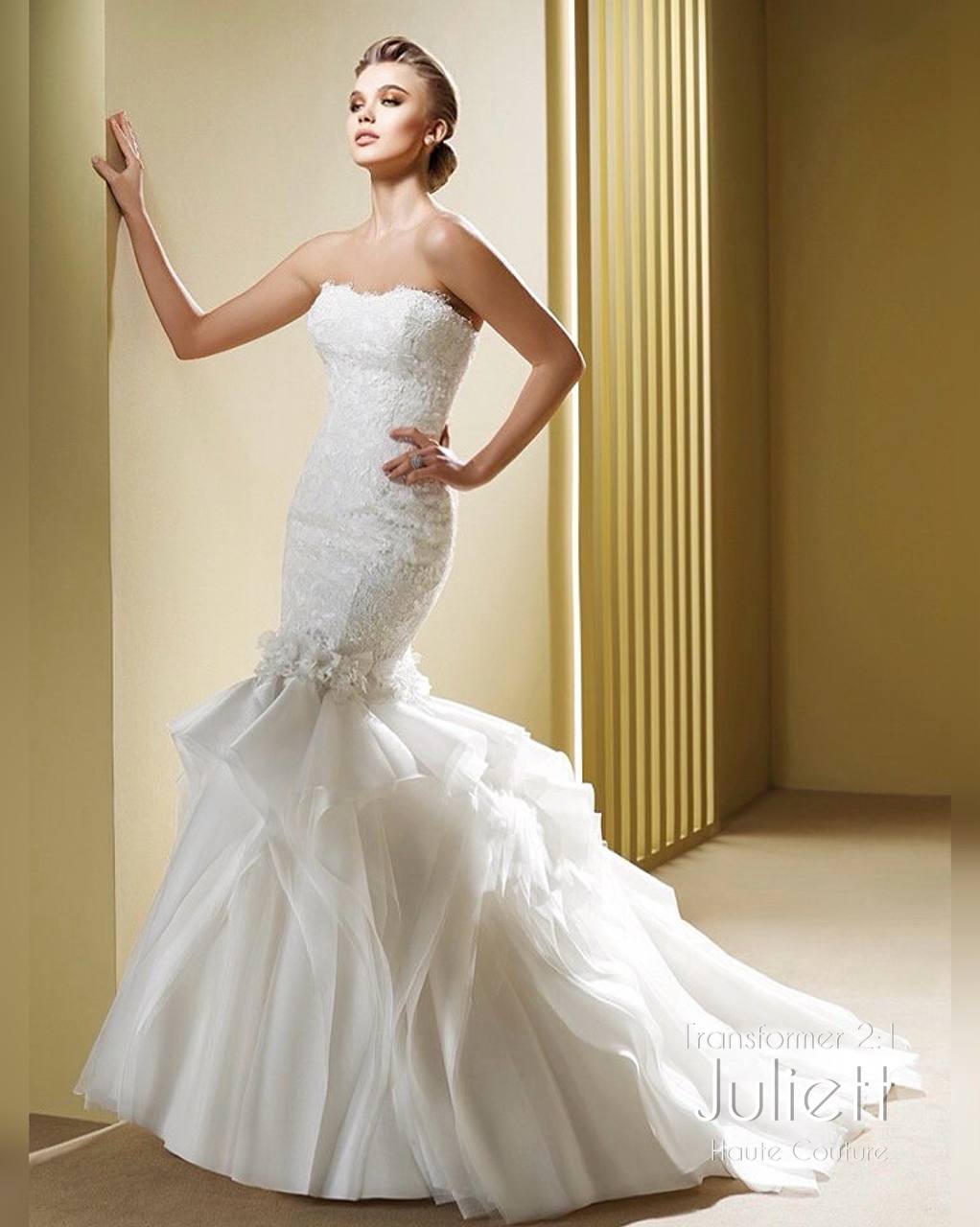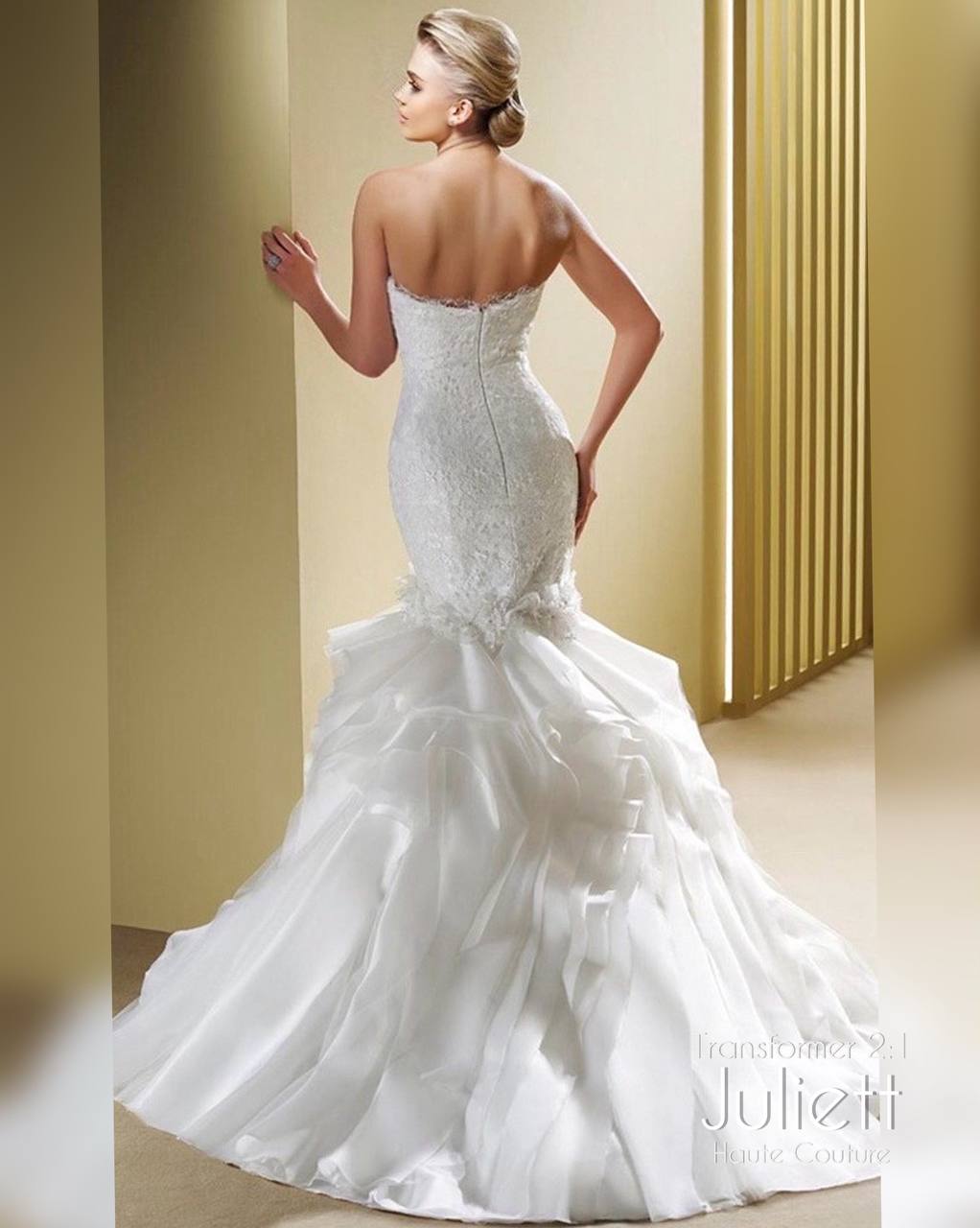 Модель-трансформер Juliett, це не просто сукня - це історія вашого особливого дня! Створене у Франції з вишуканого мережива «Макраме» і матової органзи - воно підкреслить вашу жіночність і елегантність. Облягаючий корсет – втілення грації, а спідниця, що пристібається, у формі бутона троянди додасть загадковості вашому образу. Цього дня будьте впевнені у своїй неповторності.