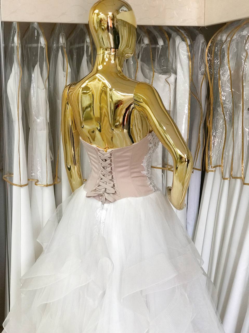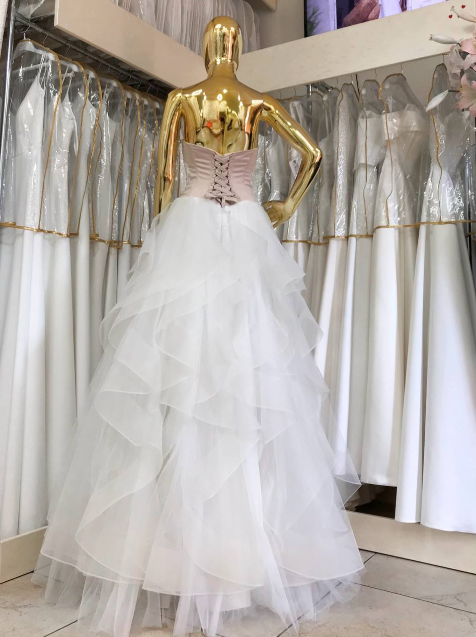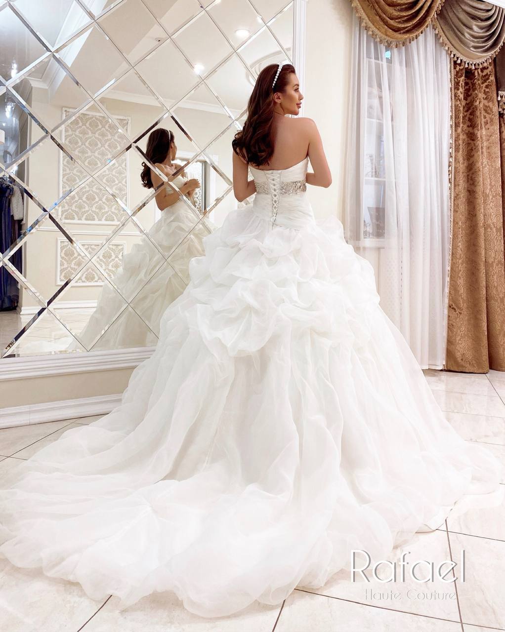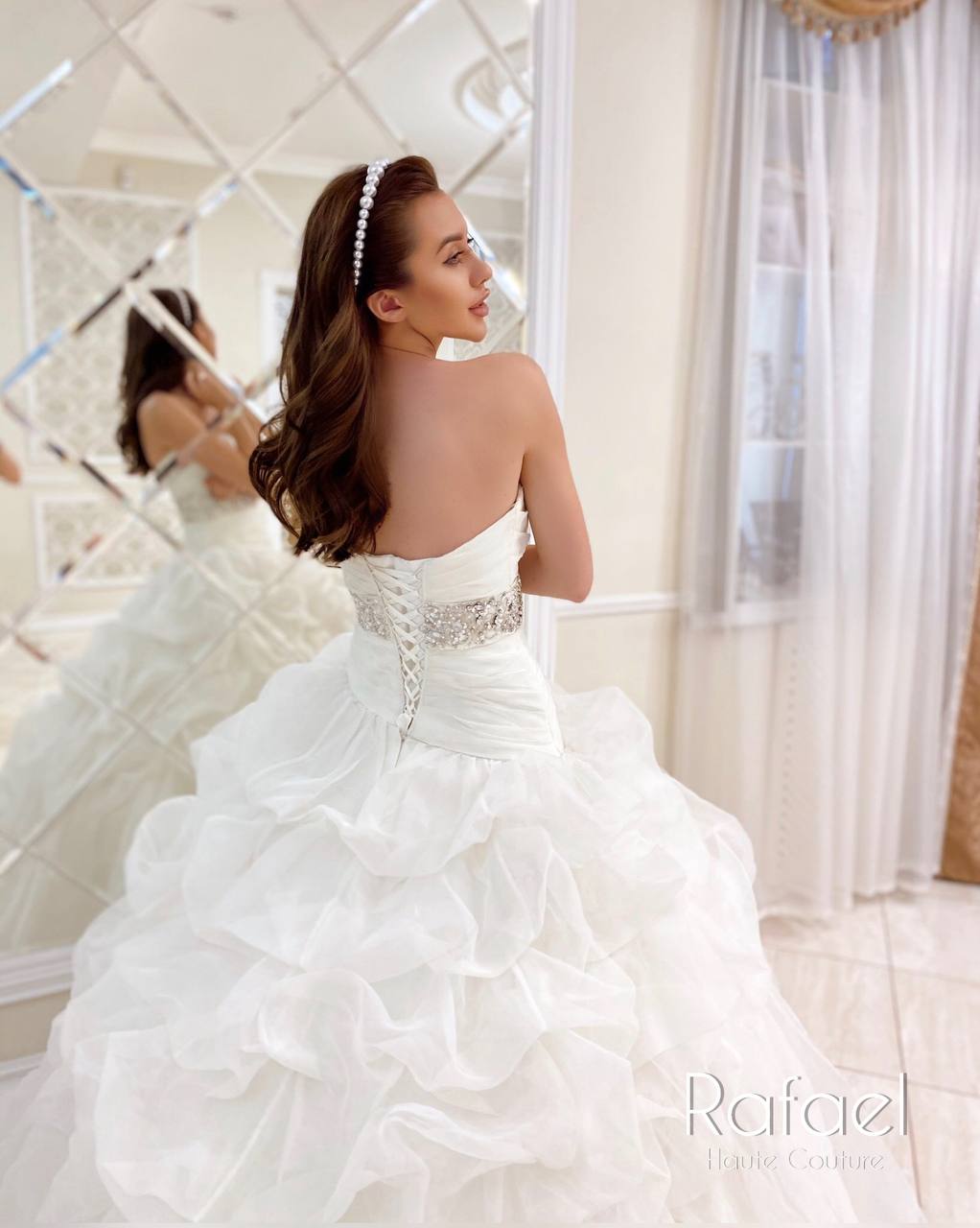 Вишукана весільна сукня, що зачаровує фантазійним образом. Пишна спідниця з довгим шлейфом придають розкоші, корсет «серце» доповнений вишуканим поясом вишитим з бісеру,камінців та перлинок створює справжній образ королеви!
