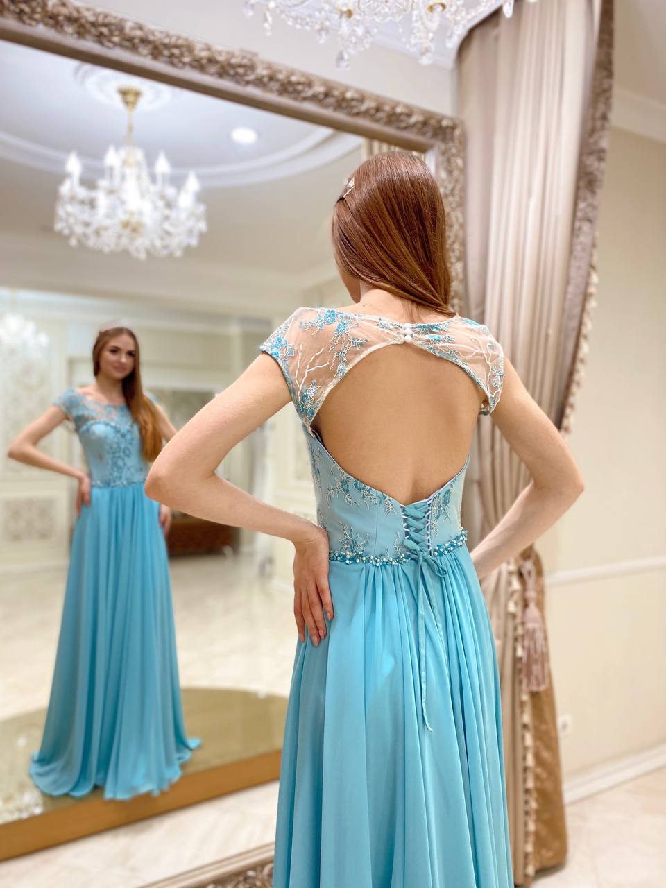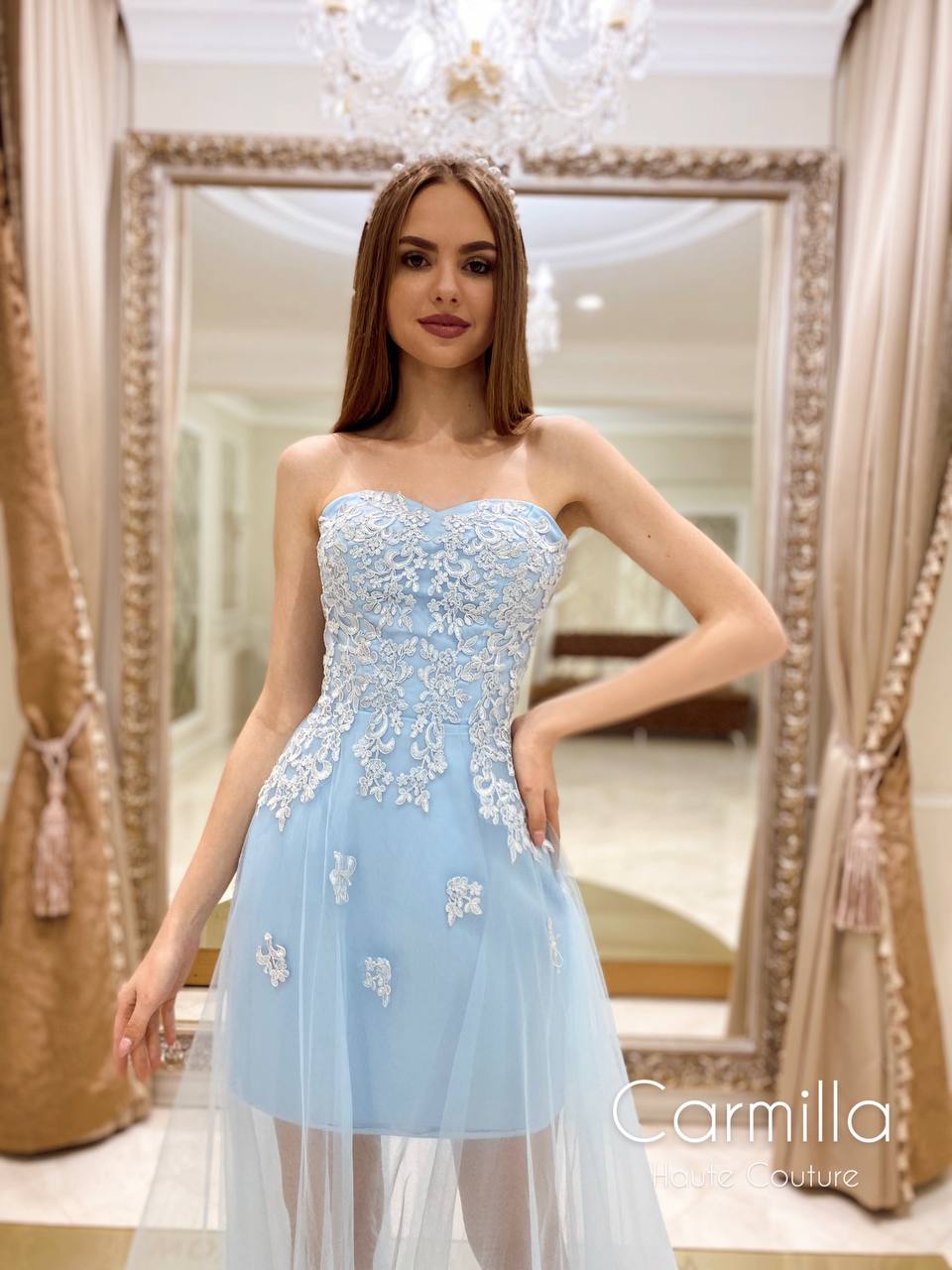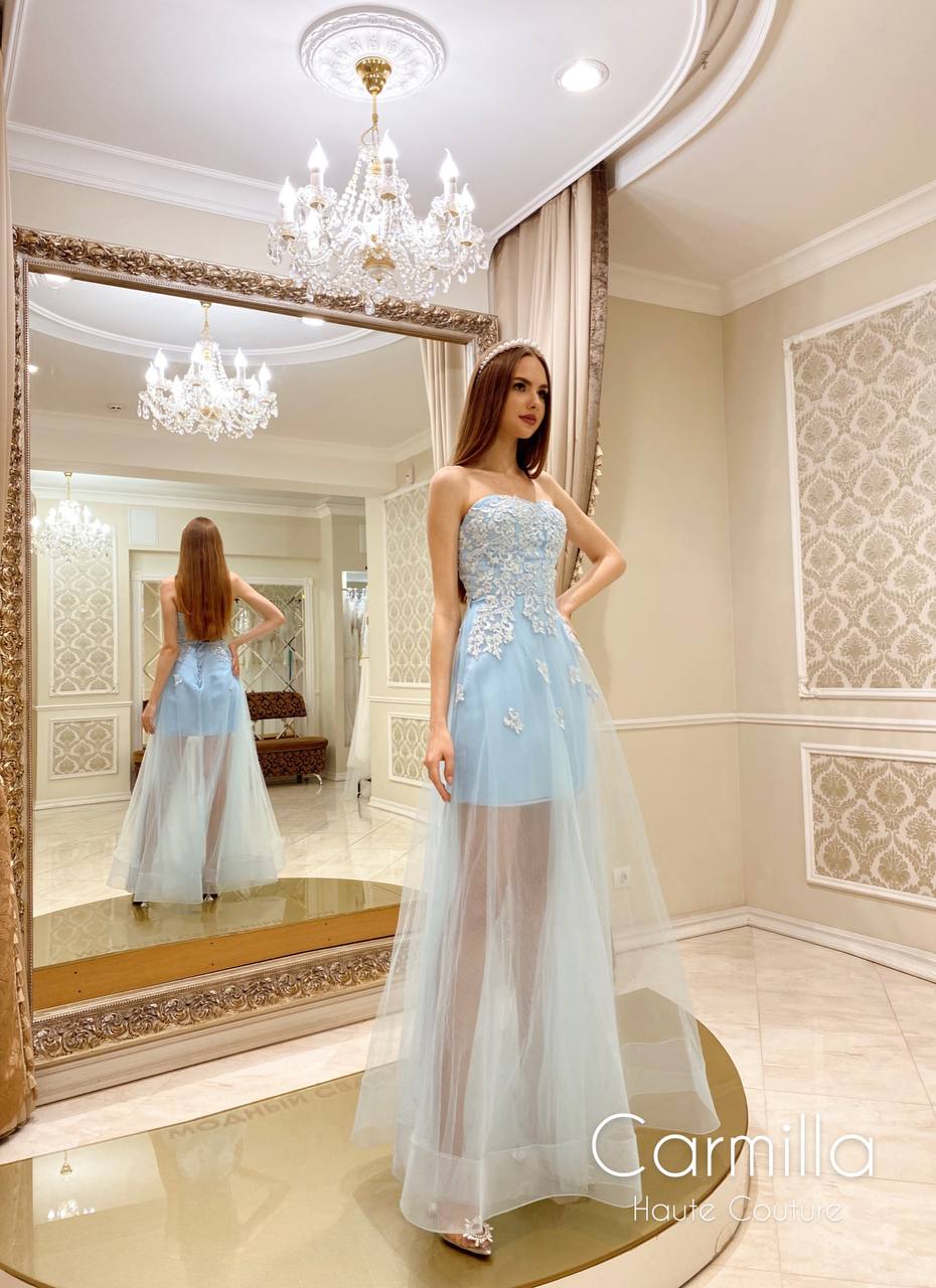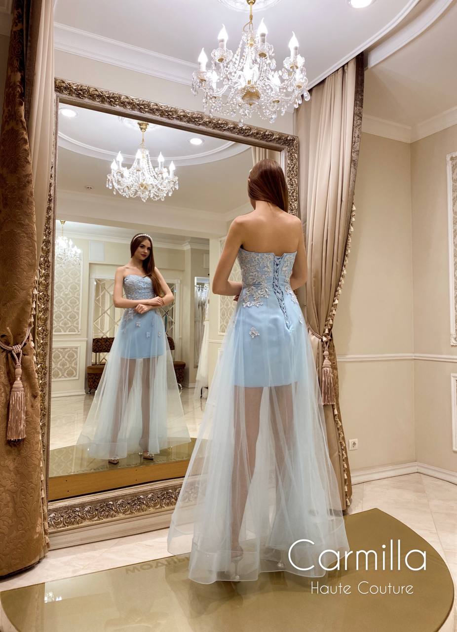 Неначе морська хвиля, саме така думка приходить коли дивишся на модель «Doris» Оголена спина та прикрашений камінням топ створюють вигляд « морської піни» а блакитна спідниця нагадує про тепле літнє море.