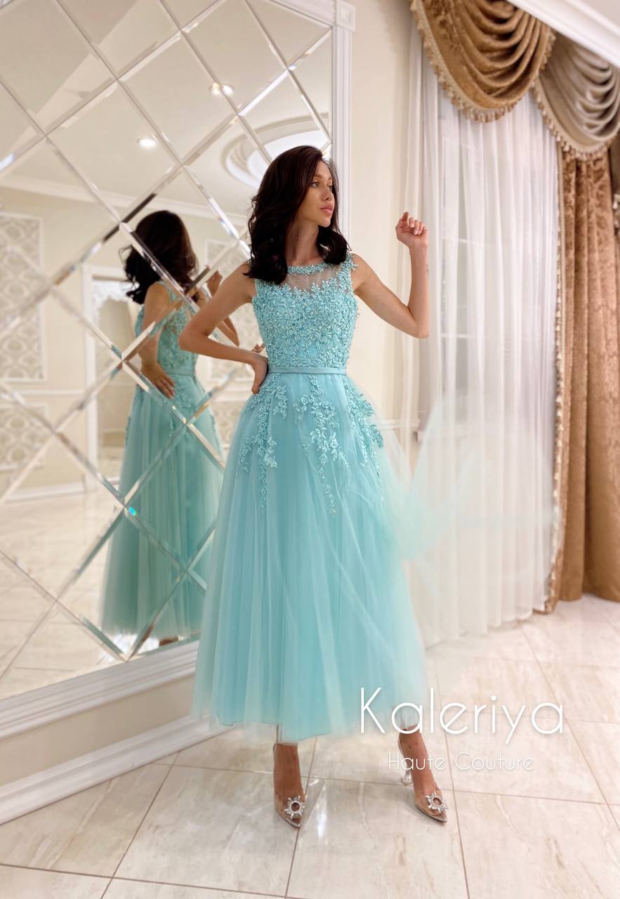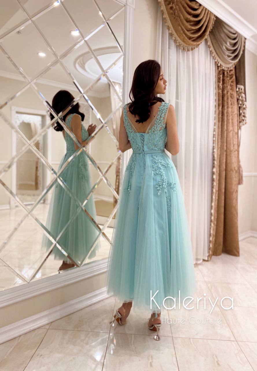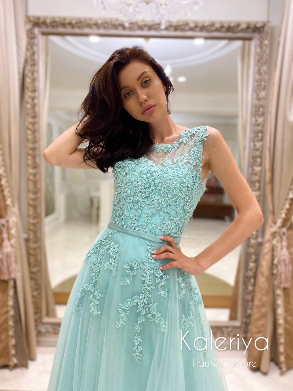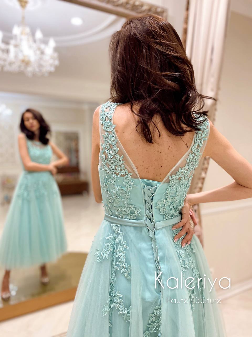 Варто відзначити, що ця сукня підходить практично всім типажам: в такому вбранні ефектно виглядатимуть блондинки і брюнетки, а також рудоволосі красуні. Доповненням до неперевершеного кольору є розсип квіткових аплікацій з намистинами на ліфі, які плавно переходять на пишну міді спідницю.
