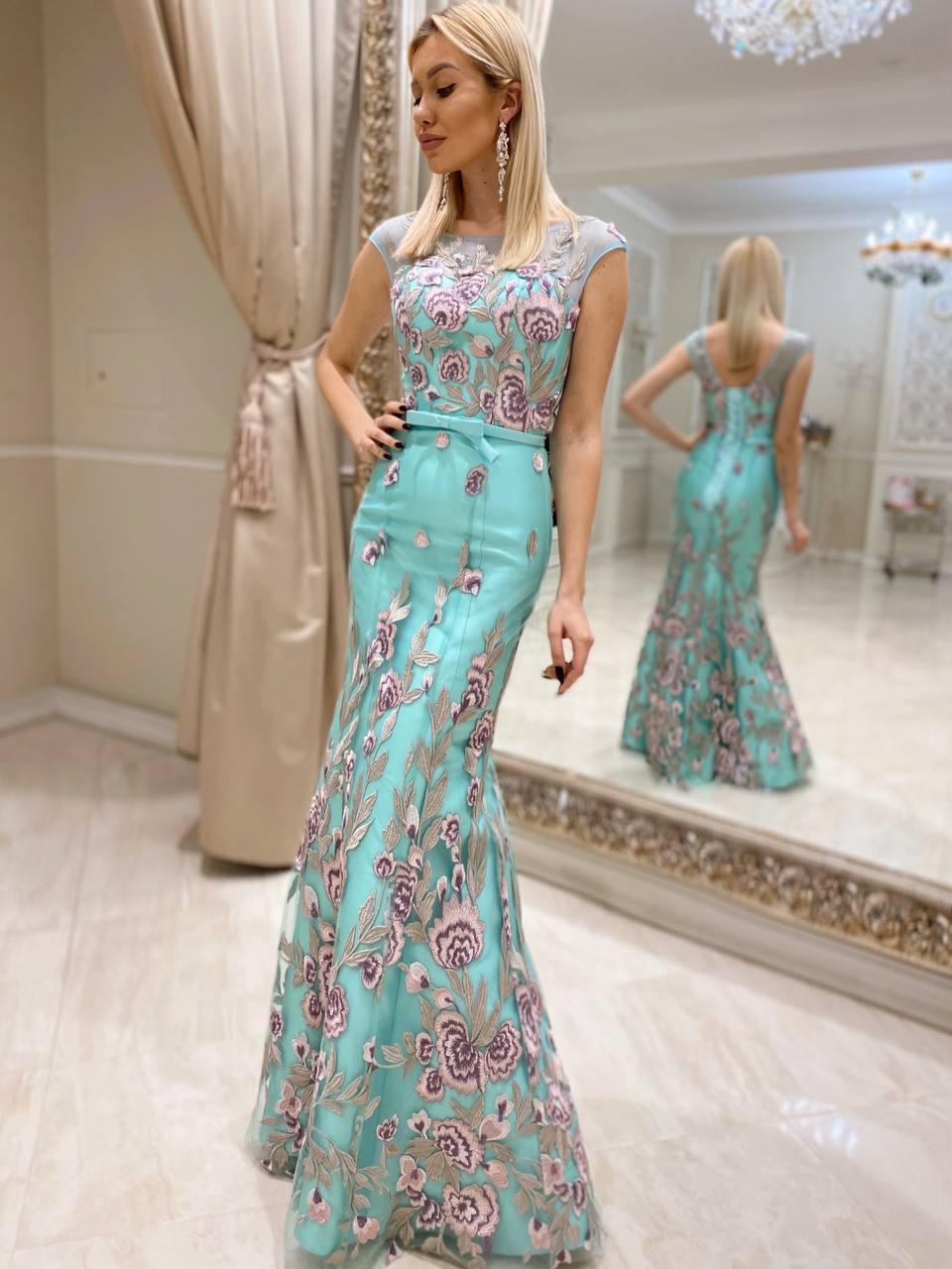 Чудова вечірня сукня по всьому ліфу якої проходить ажурна квіткова вишивка. Цікавою особливістю наряду є низ - міні-сукня доповнена прозорою довгою фатіновою спідницею, що дозволяє дівчині мигцем продемонструвати оточуючим стрункі ніжки і дизайнерське взуття. Гарантуємо, що в цій сукні Ви будете чарівною.