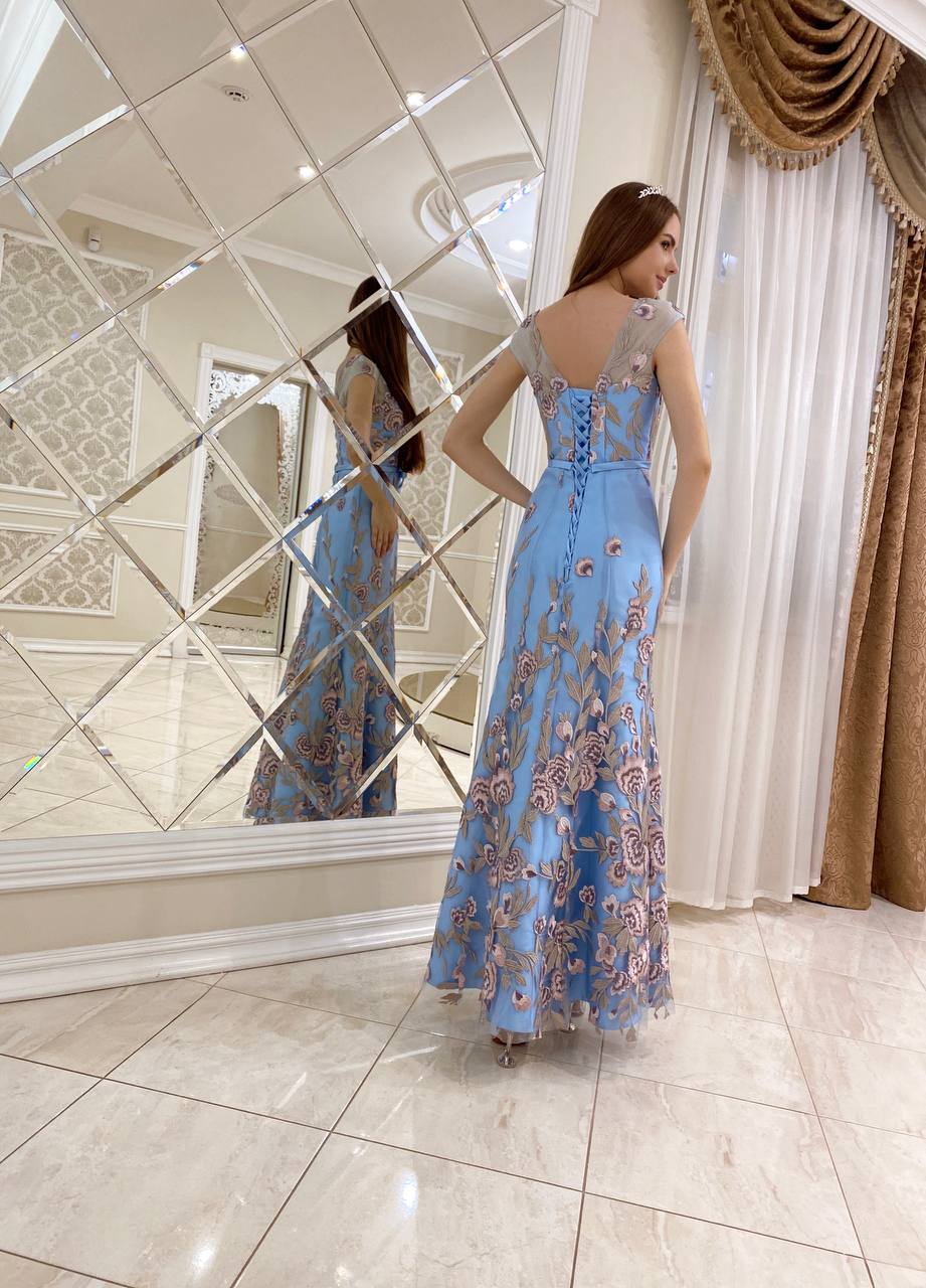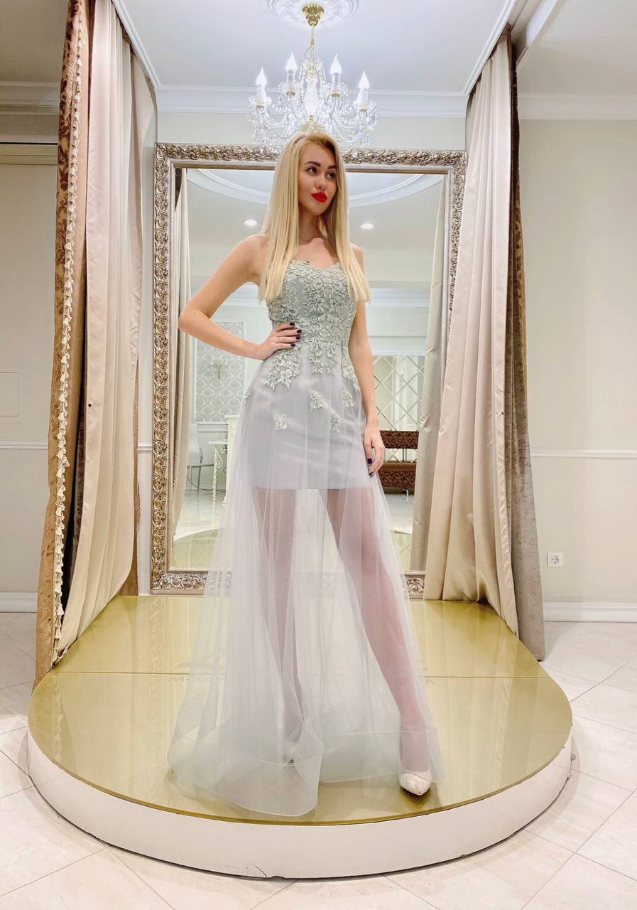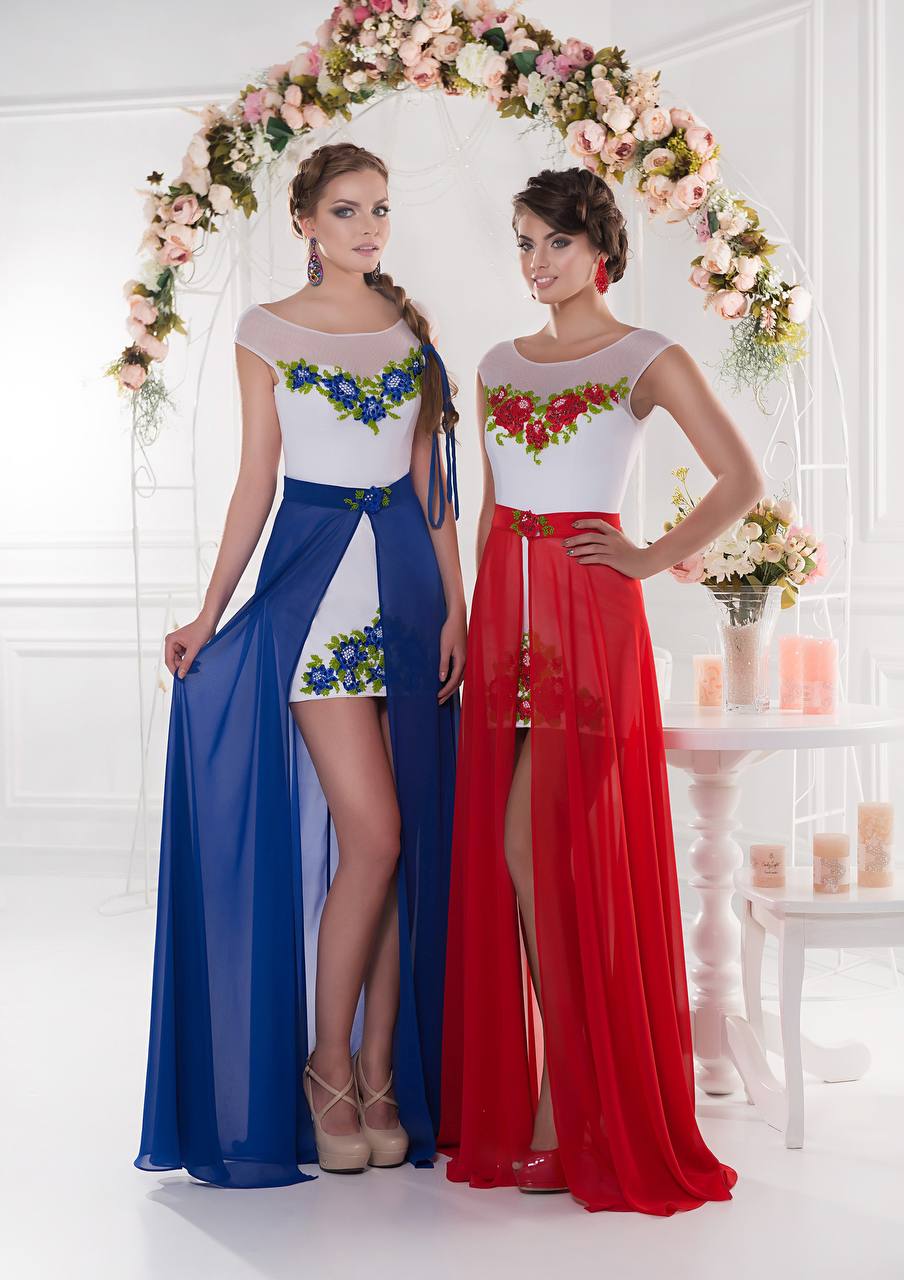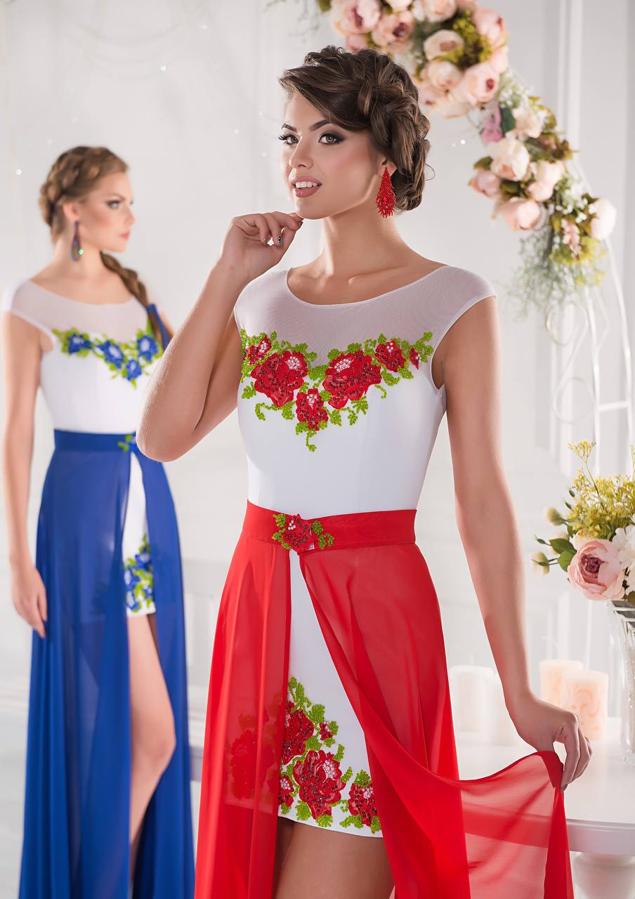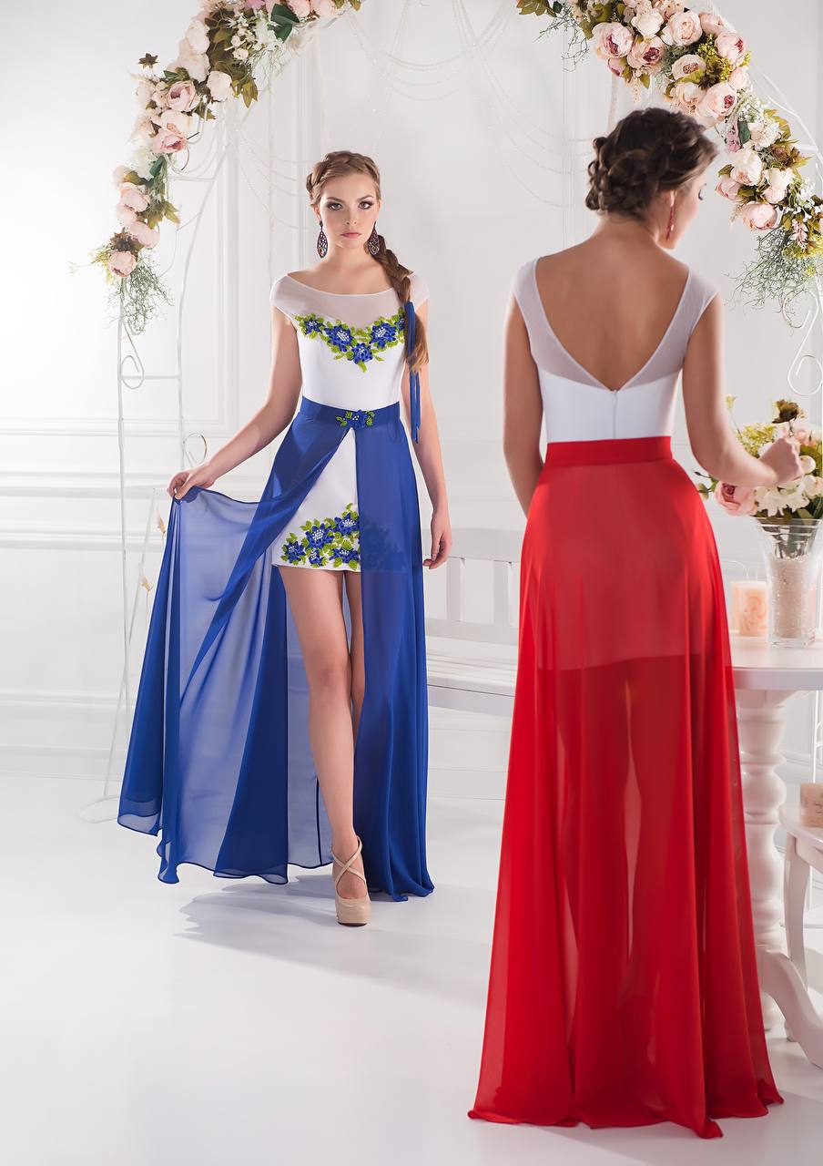 Чудова вечірня сукня по всьому ліфу якої проходить ажурна квіткова вишивка. Цікавою особливістю наряду є низ - міні-сукня доповнена прозорою довгою фатіновою спідницею, що дозволяє дівчині мигцем продемонструвати оточуючим стрункі ніжки і дизайнерське взуття. Гарантуємо, що в цій сукні Ви будете чарівною.