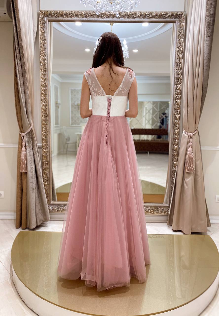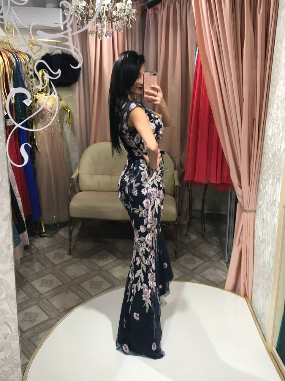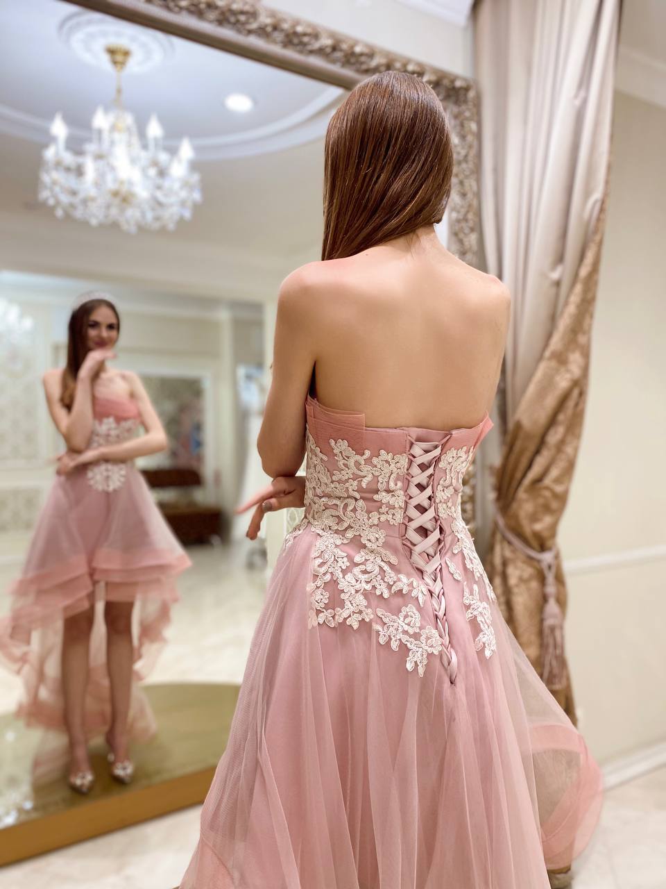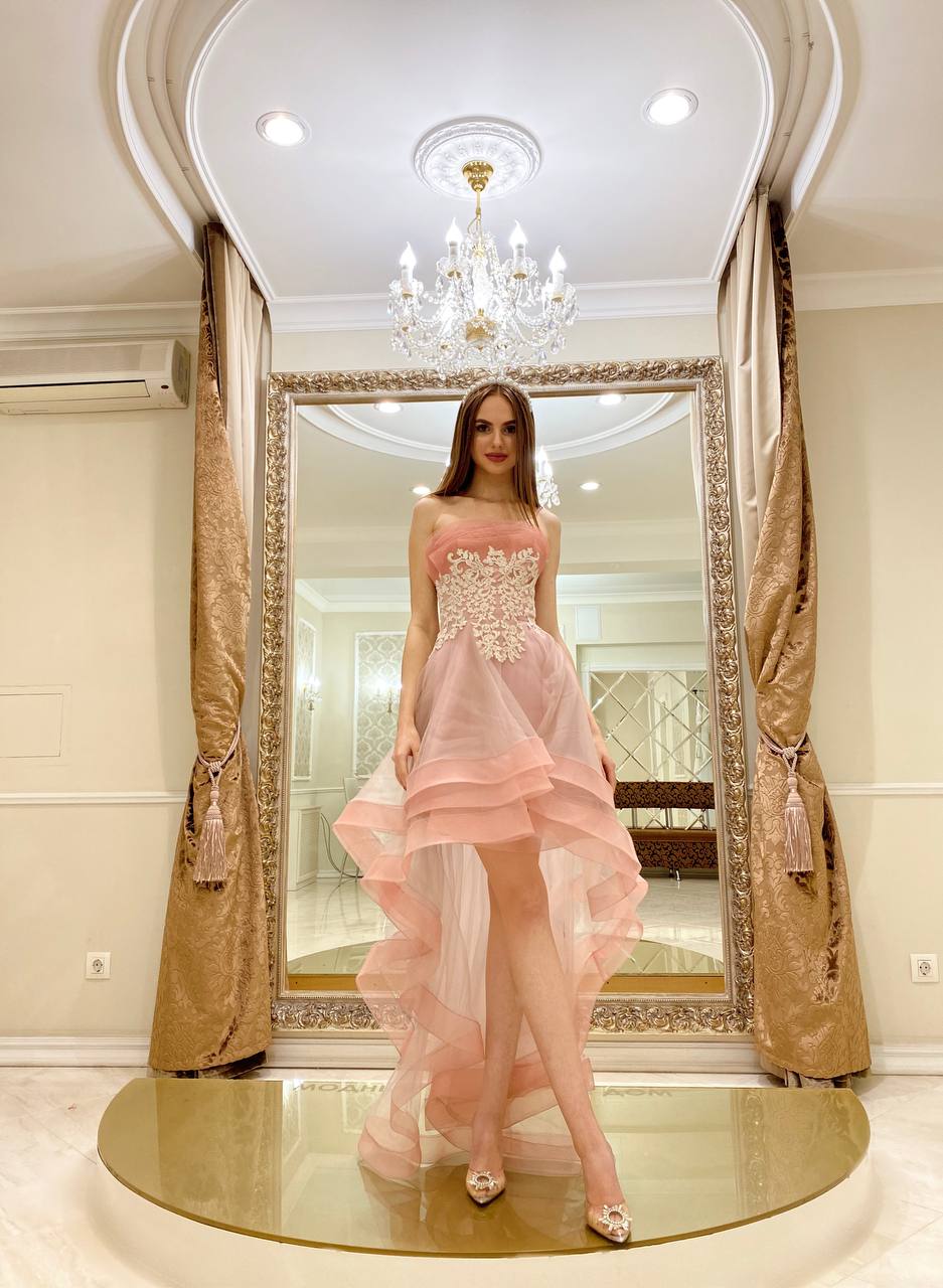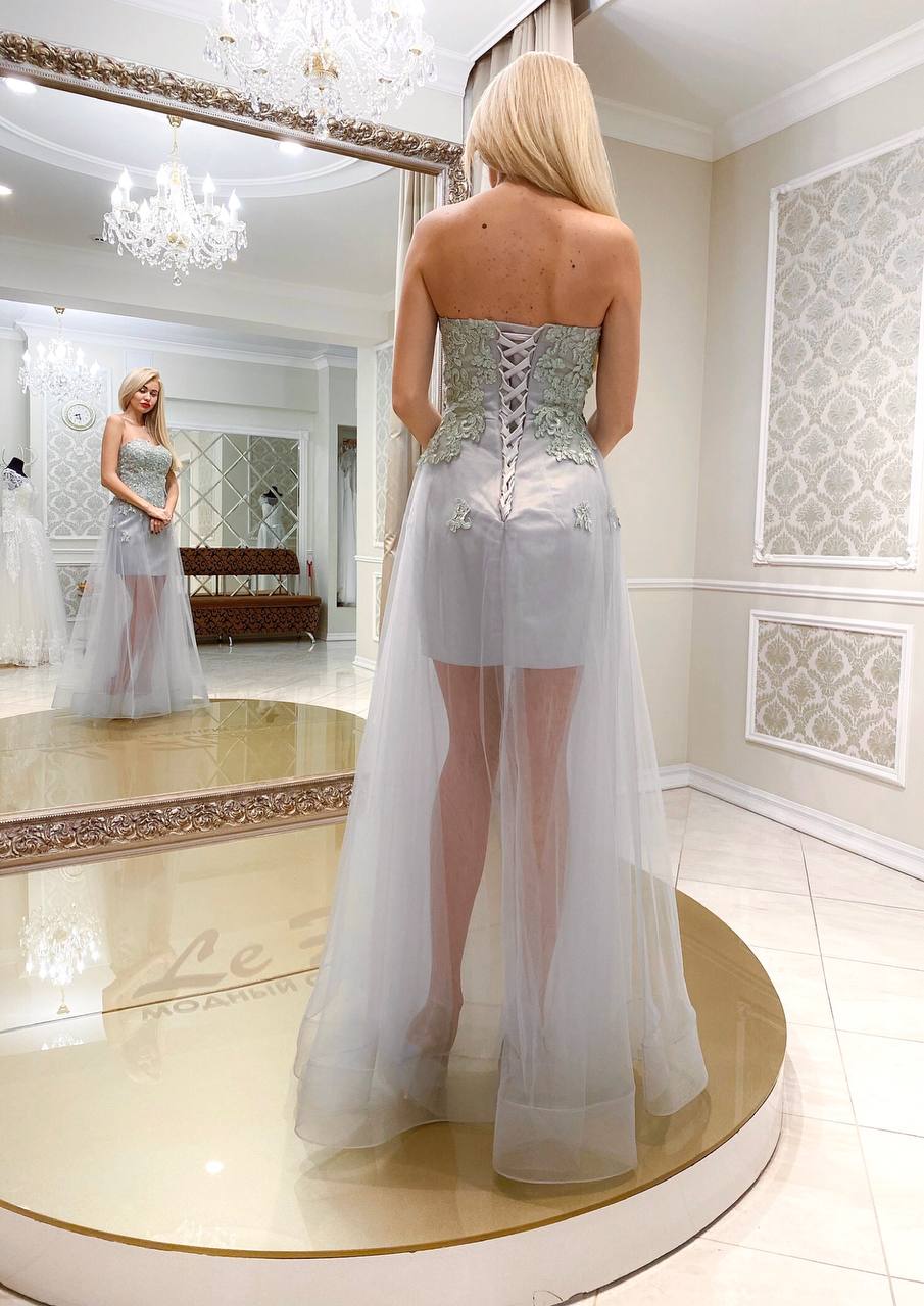 Чудова вечірня сукня по всьому ліфу якої проходить ажурна квіткова вишивка. Цікавою особливістю наряду є низ - міні-сукня доповнена прозорою довгою фатіновою спідницею, що дозволяє дівчині мигцем продемонструвати оточуючим стрункі ніжки і дизайнерське взуття. Гарантуємо, що в цій сукні Ви будете чарівною.