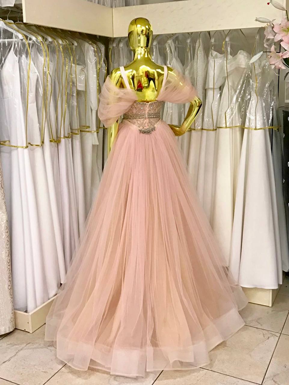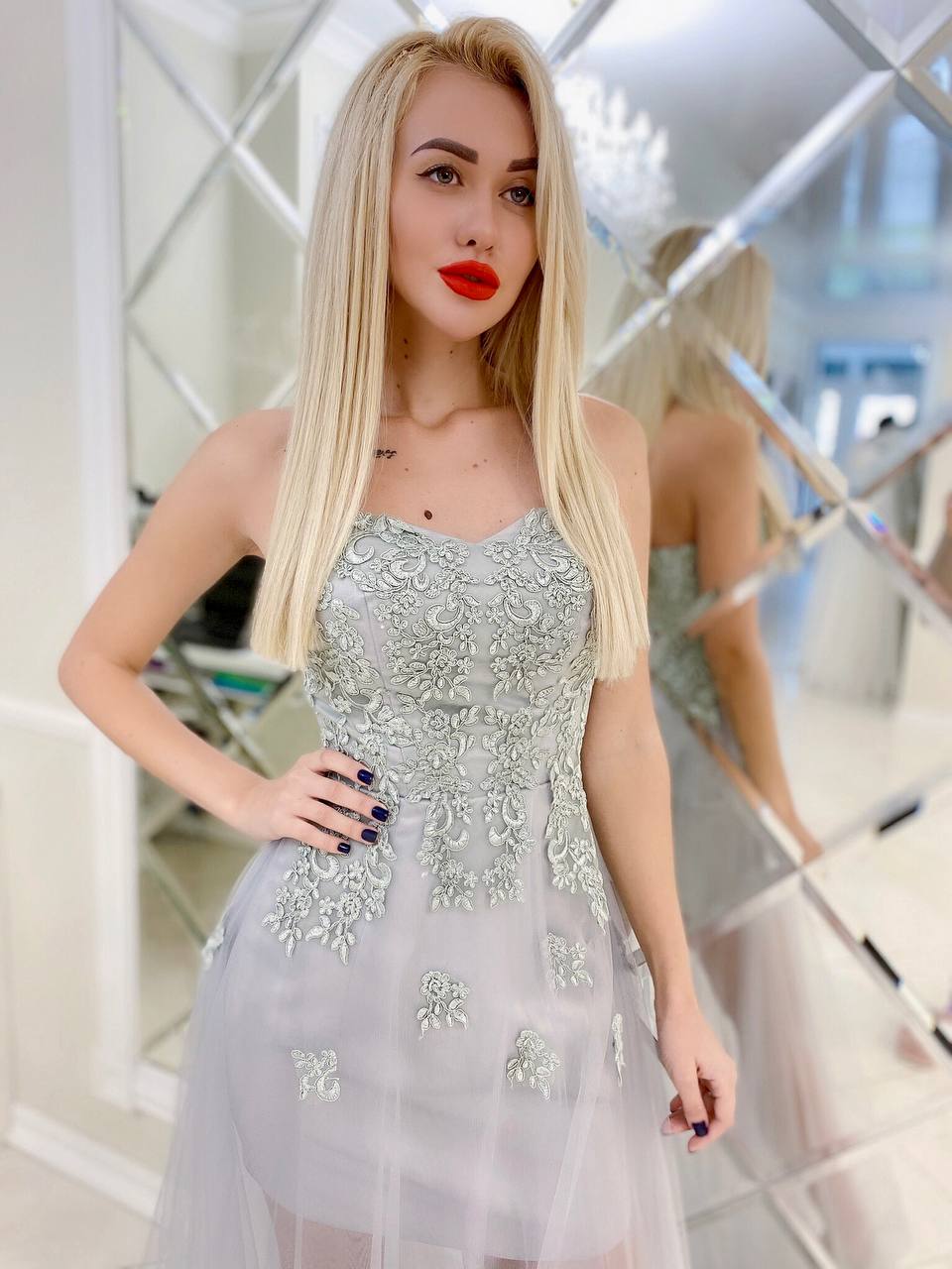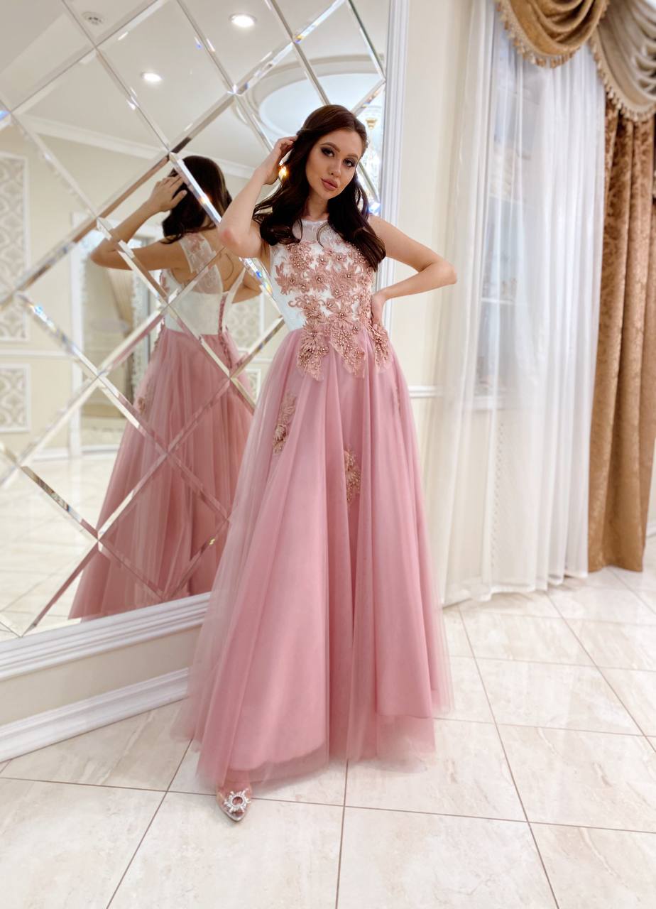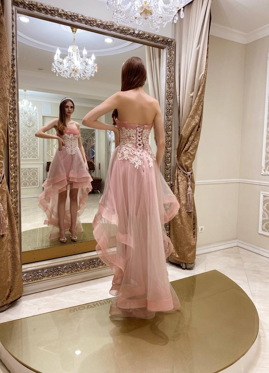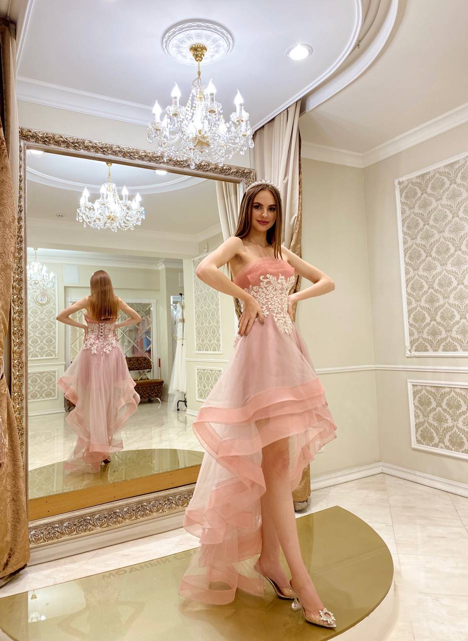 Чудова вечірня сукня по всьому ліфу якої проходить ажурна квіткова вишивка. Цікавою особливістю наряду є низ - міні-сукня доповнена прозорою довгою фатіновою спідницею, що дозволяє дівчині мигцем продемонструвати оточуючим стрункі ніжки і дизайнерське взуття. Гарантуємо, що в цій сукні Ви будете чарівною.