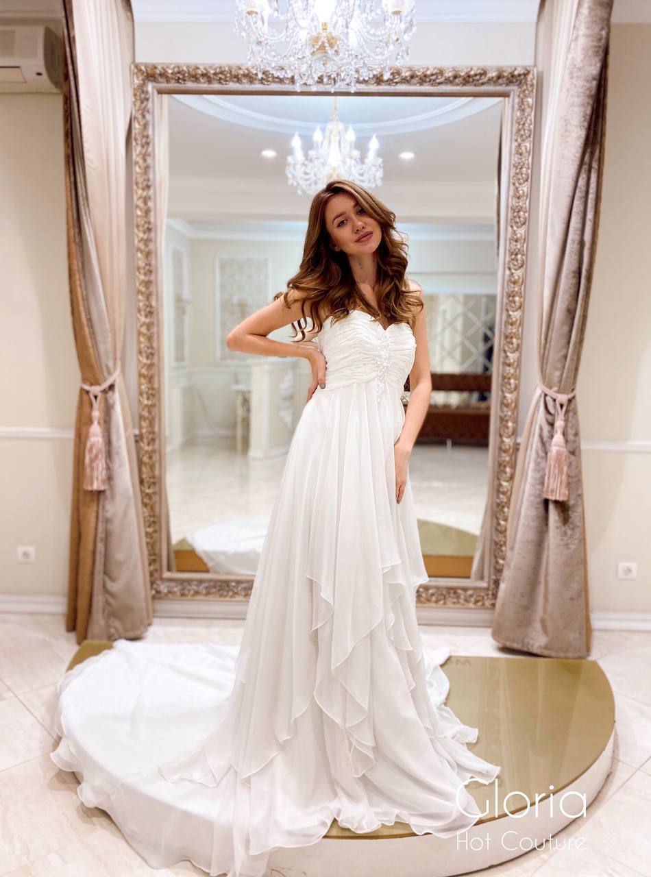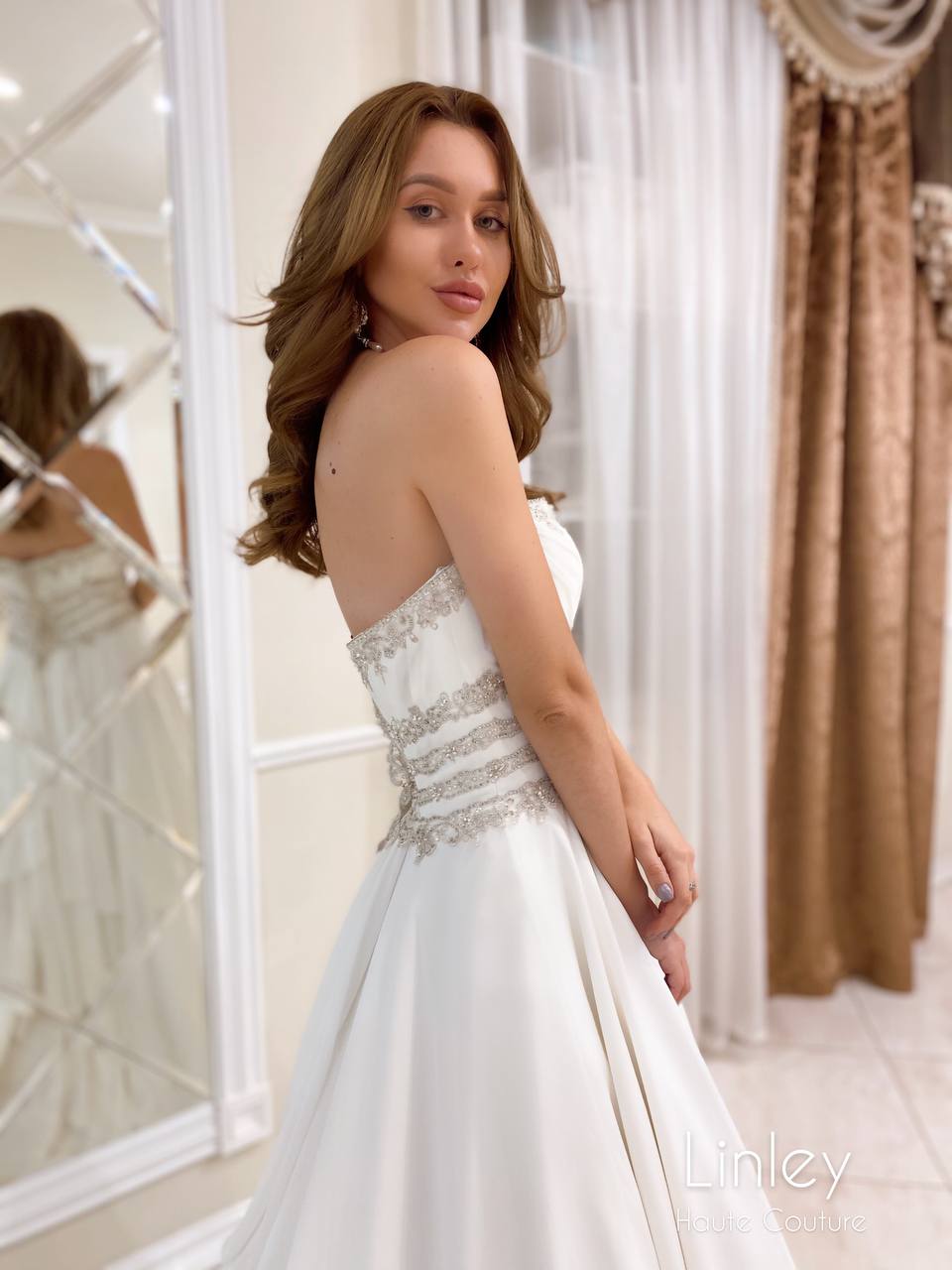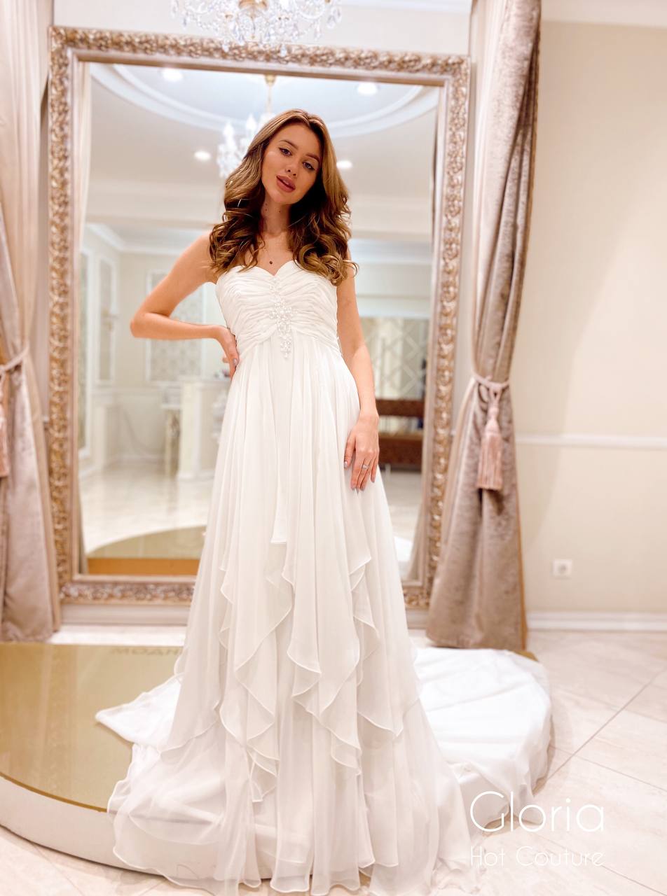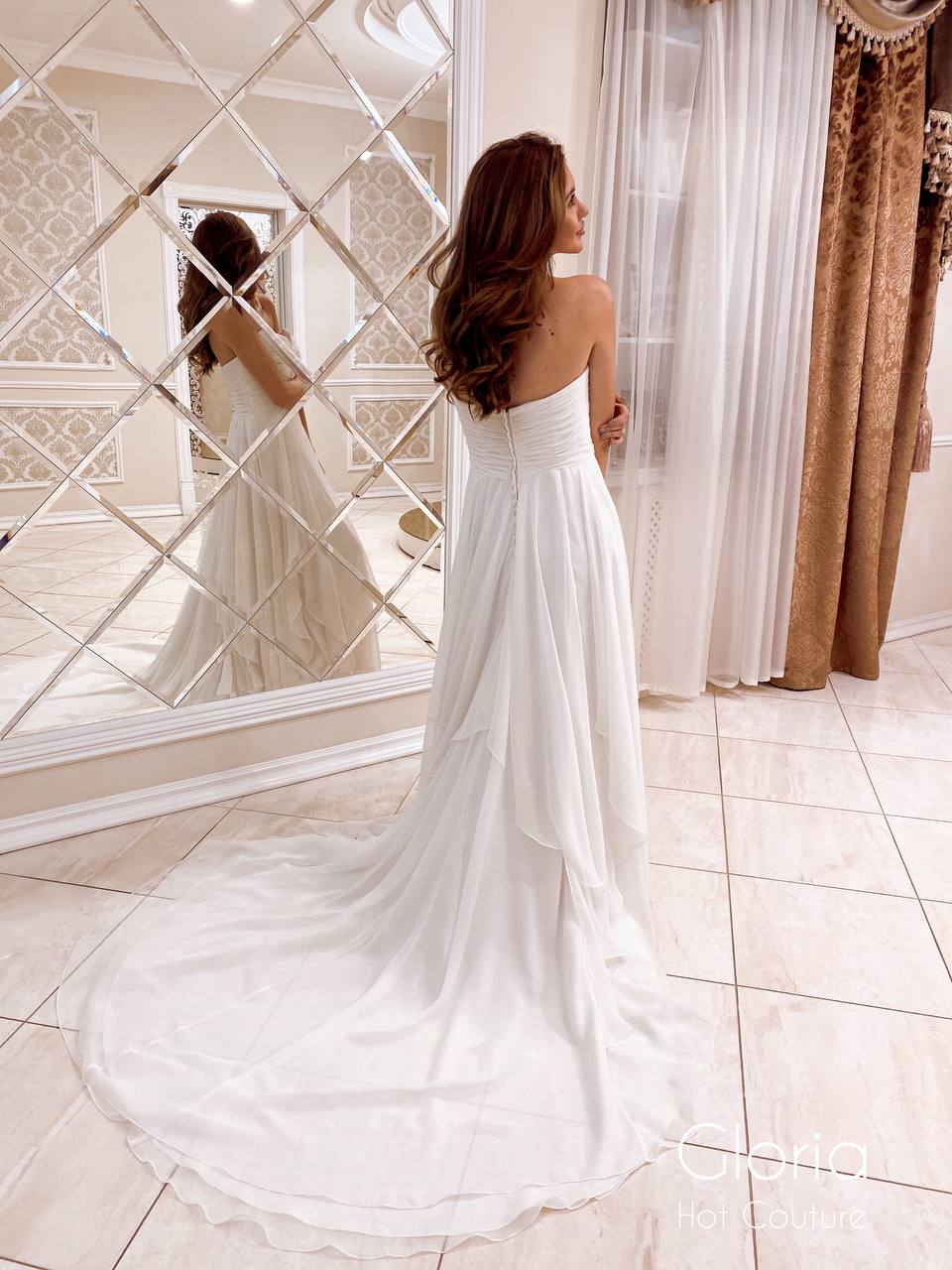 Гармонія стилю та свіжості! Модель Viva з елегантною асиметрією на одному плечі надасть неповторну вишуканість. Це ідеальний вибір для тих, хто шукає сучасне та стильне рішення для весільного образу. Відчуйте легкість та витонченість у цьому особливому моменті вашого життя!