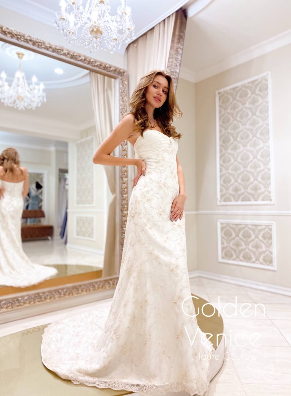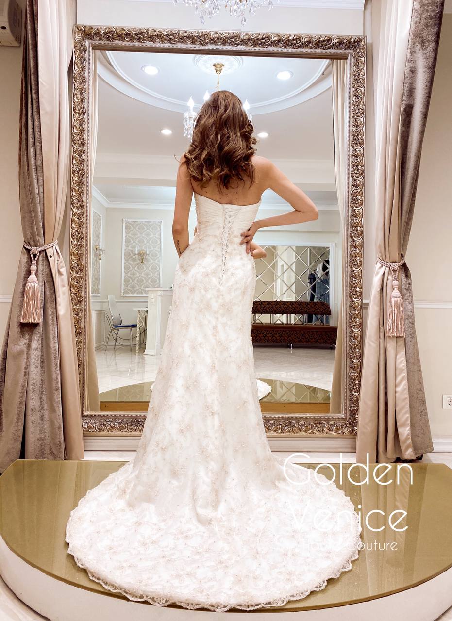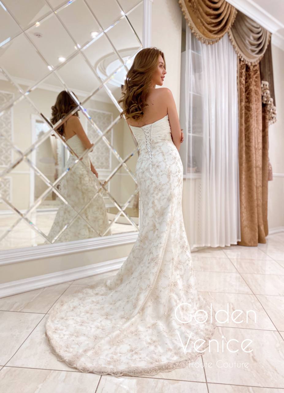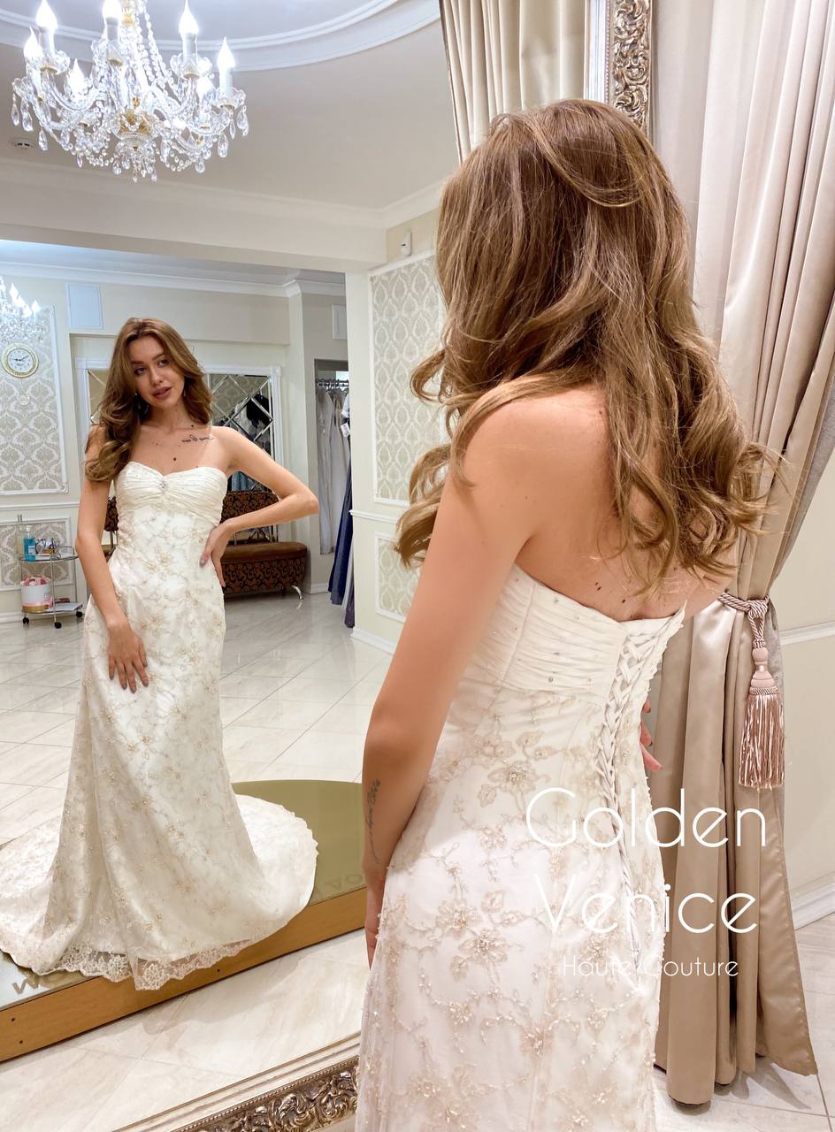 Неймовірна весільна сукня від Кутюр у кольорі веніціанського золота. Справжній витвір мистецтва у візерунках аленсонського мережива для найвитонченішої Нареченої.