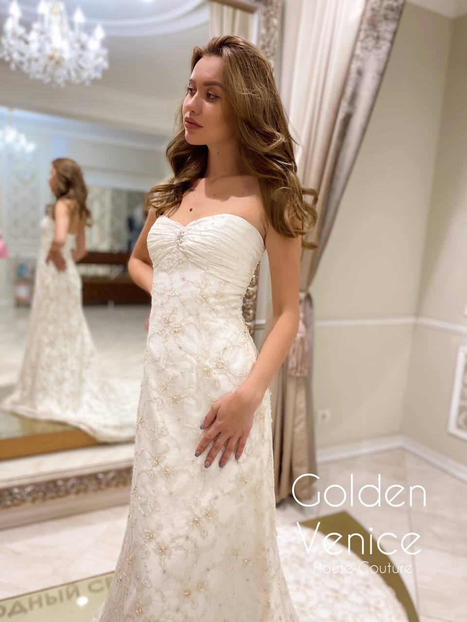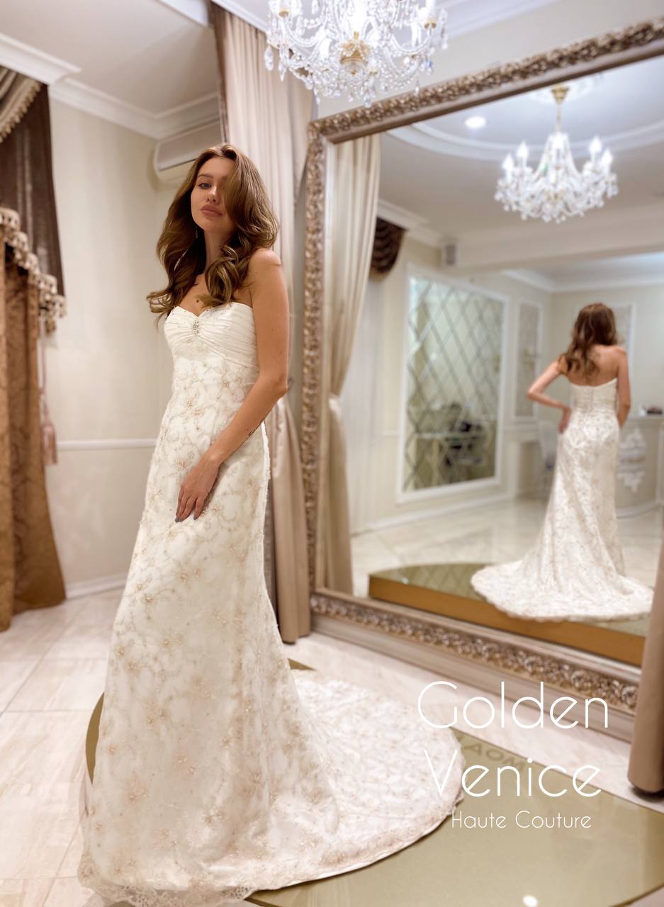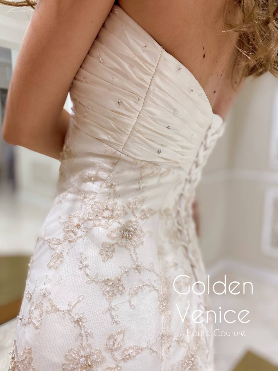 Неймовірна весільна сукня від Кутюр у кольорі веніціанського золота. Справжній витвір мистецтва у візерунках аленсонського мережива для найвитонченішої Нареченої.