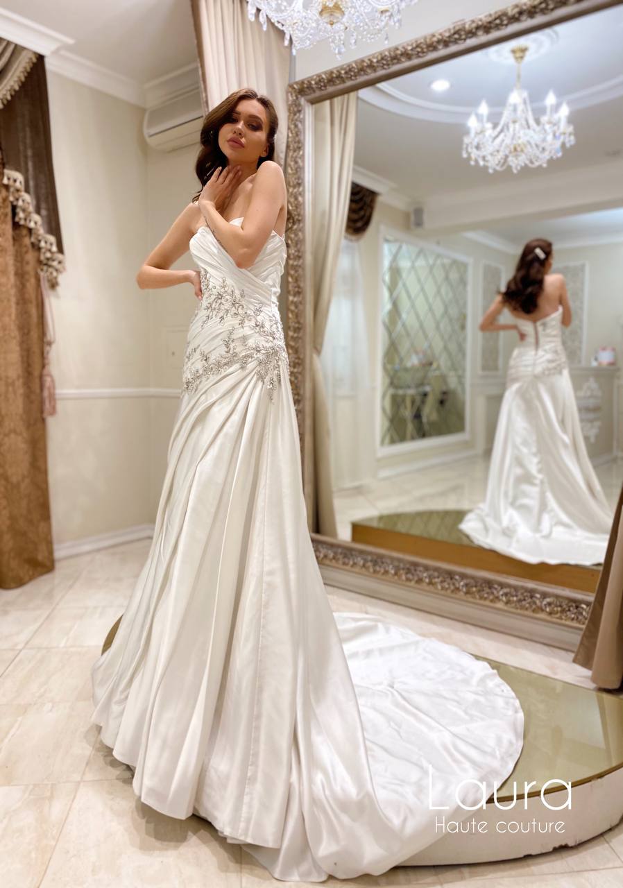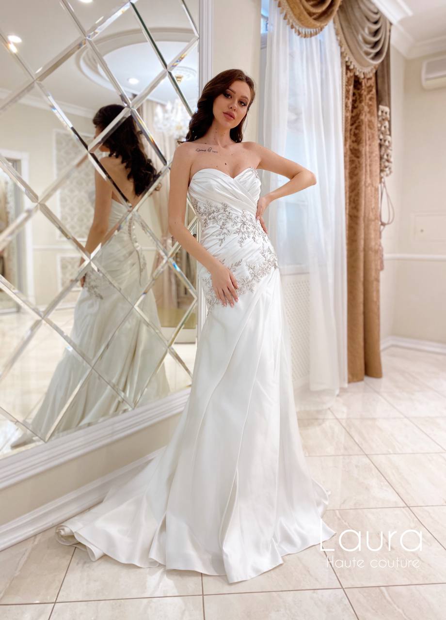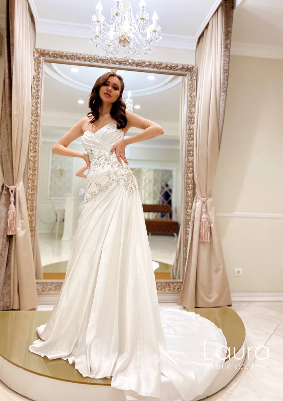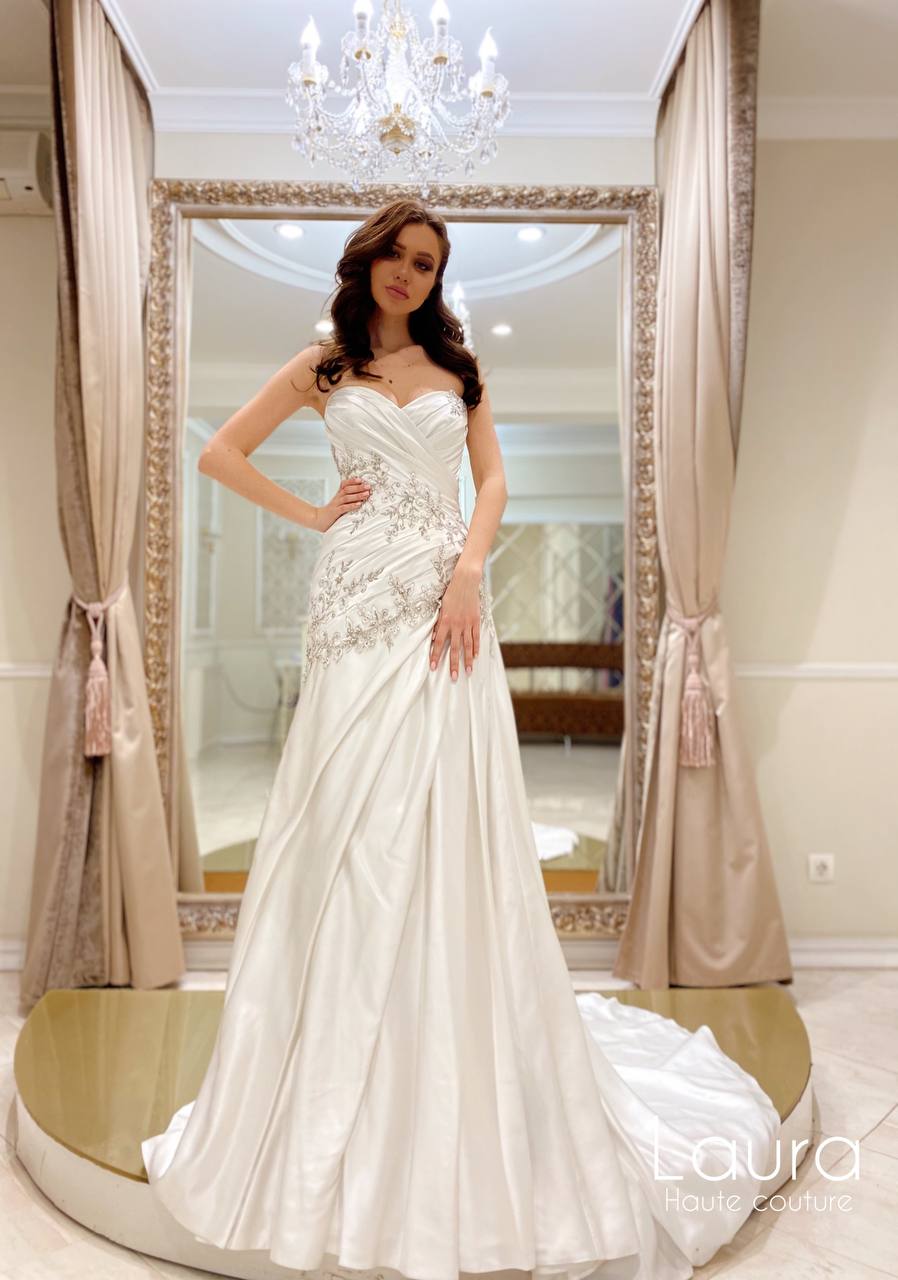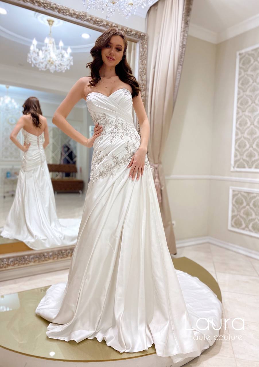 Приголомшлива атласна сукня з ніжною вишивкою бісером у вигляді квітів. Вишивка підкреслює талію і лінію стегон, що забезпечує неповторність образу та створює ефект весняної свіжості та чарівності. І звісно не обійтися без легкої та витонченої спідниці-годе, і корсета у вигляді серця, який красиво виділяє декольте.
