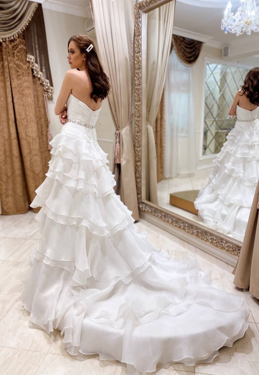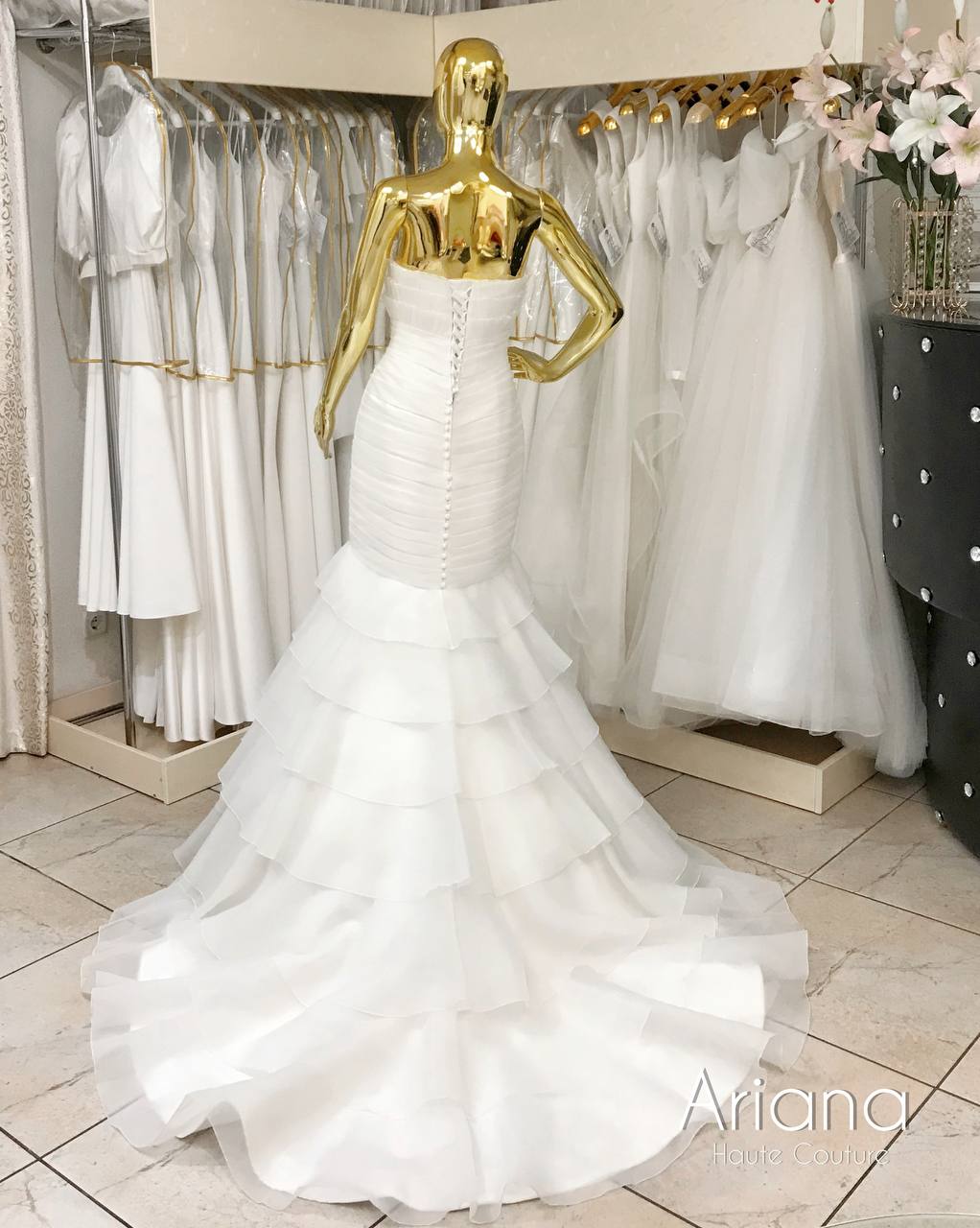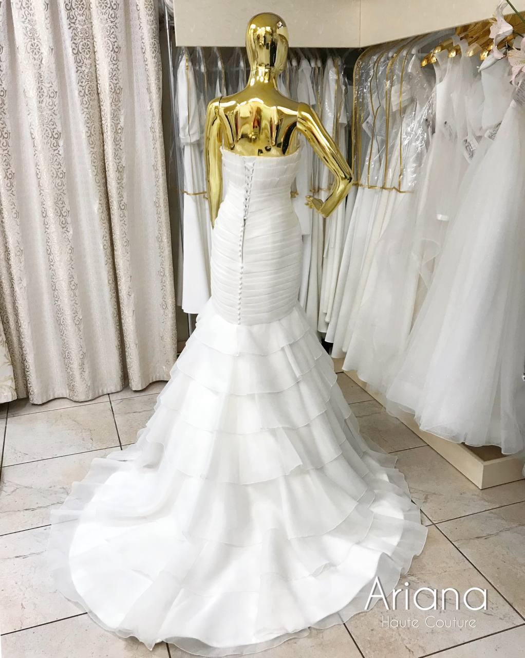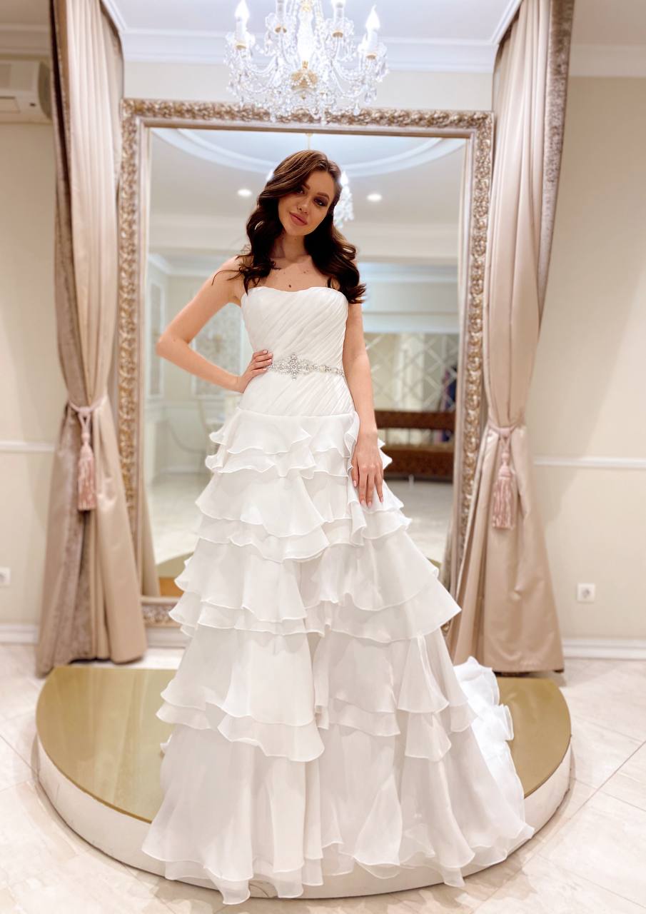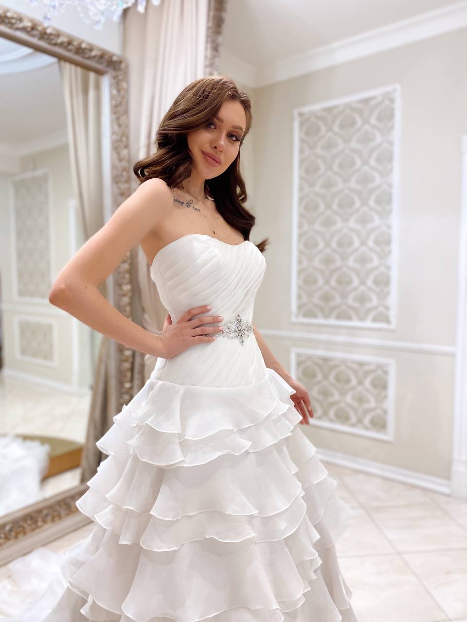 Легка, повітряна постать при вигляді якої перехоплює подих! Саме такий опис підійде нареченій у цій сукні. Делікатні ґудзики на спині та візерунок з намистин прикрашає топ а багатошарова спідниця зі шлейфом перетворює дівчину у справжню квітку.