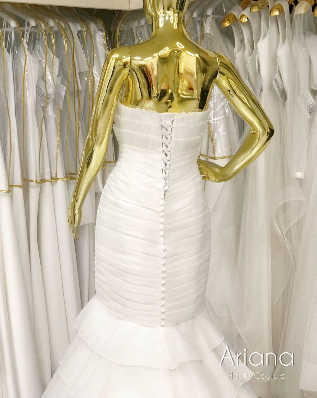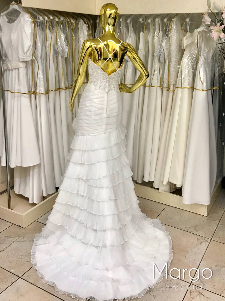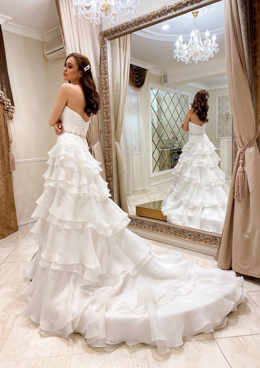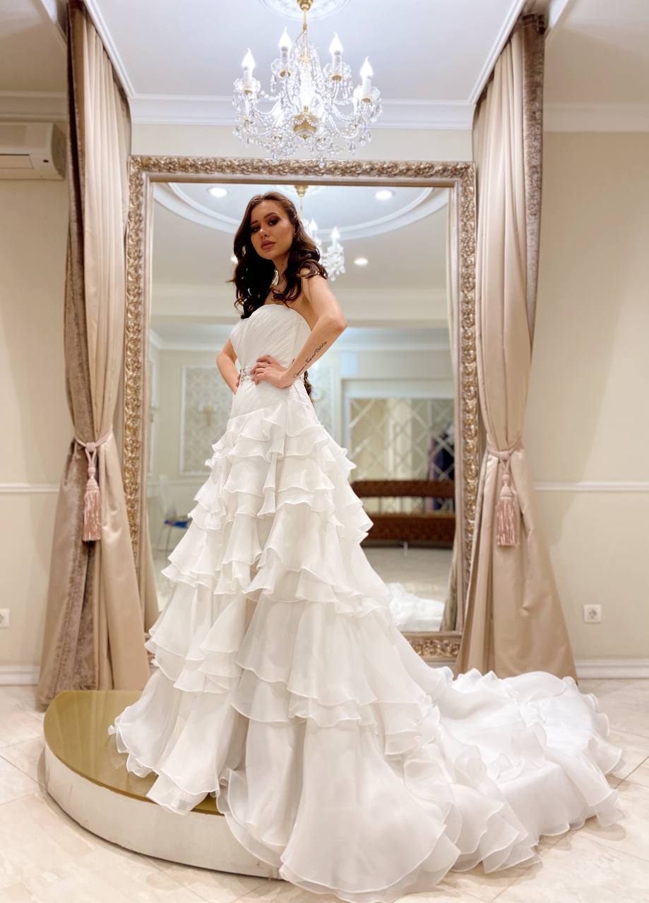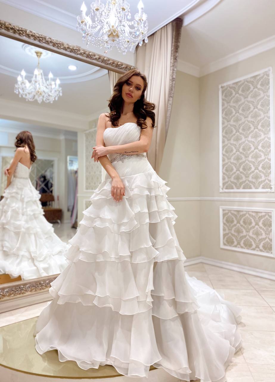 Легка, повітряна постать при вигляді якої перехоплює подих! Саме такий опис підійде нареченій у цій сукні. Делікатні ґудзики на спині та візерунок з намистин прикрашає топ а багатошарова спідниця зі шлейфом перетворює дівчину у справжню квітку.