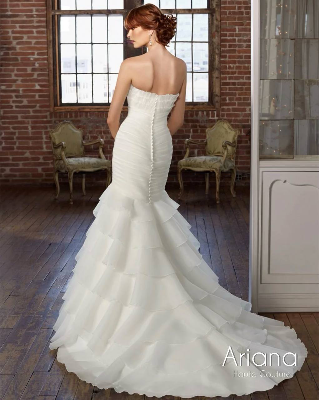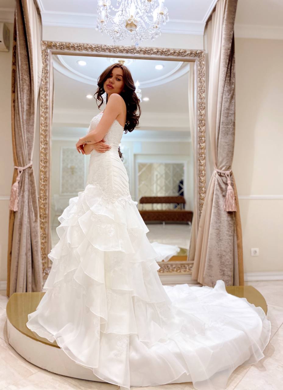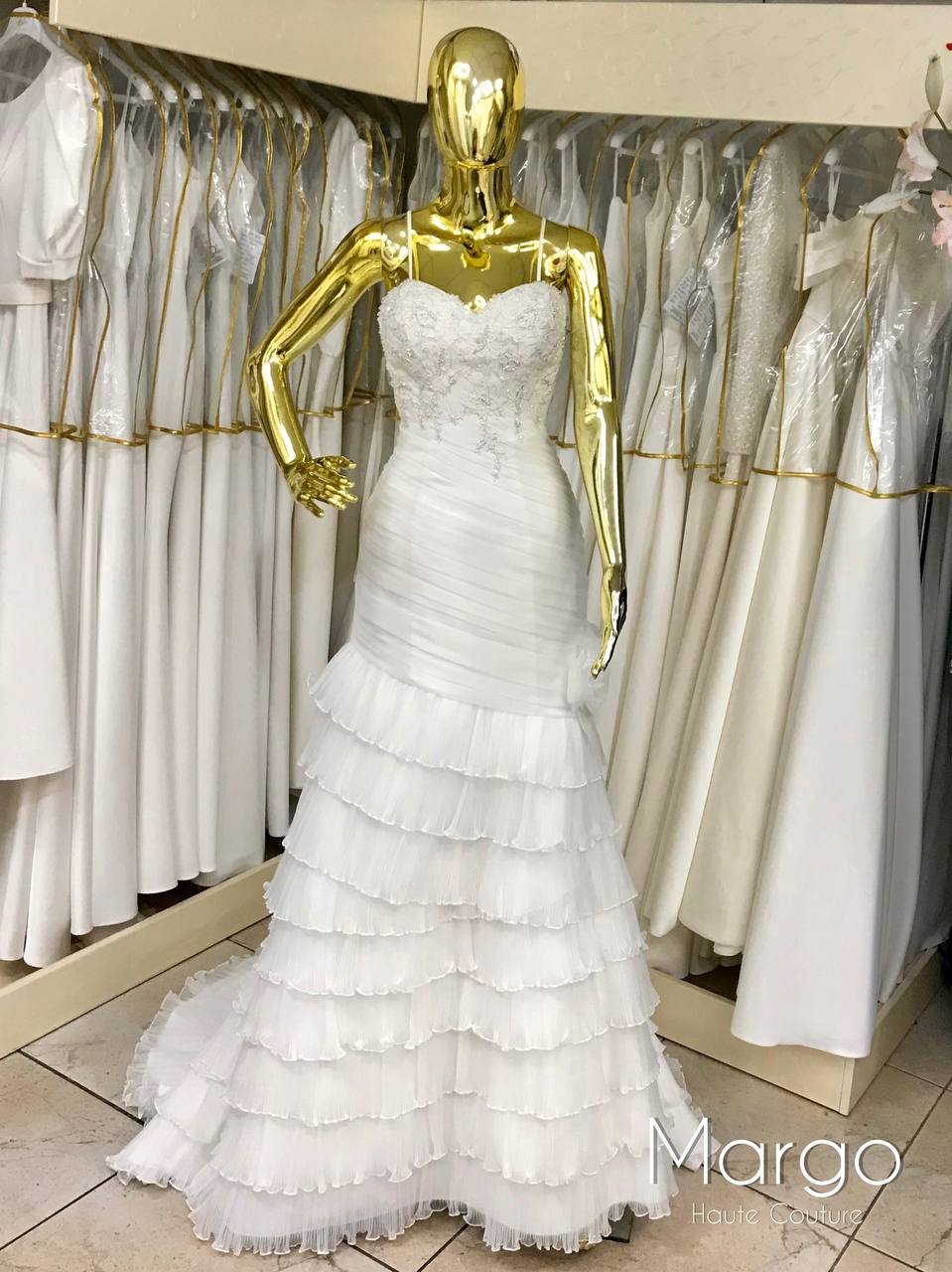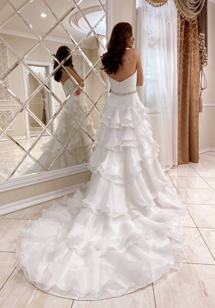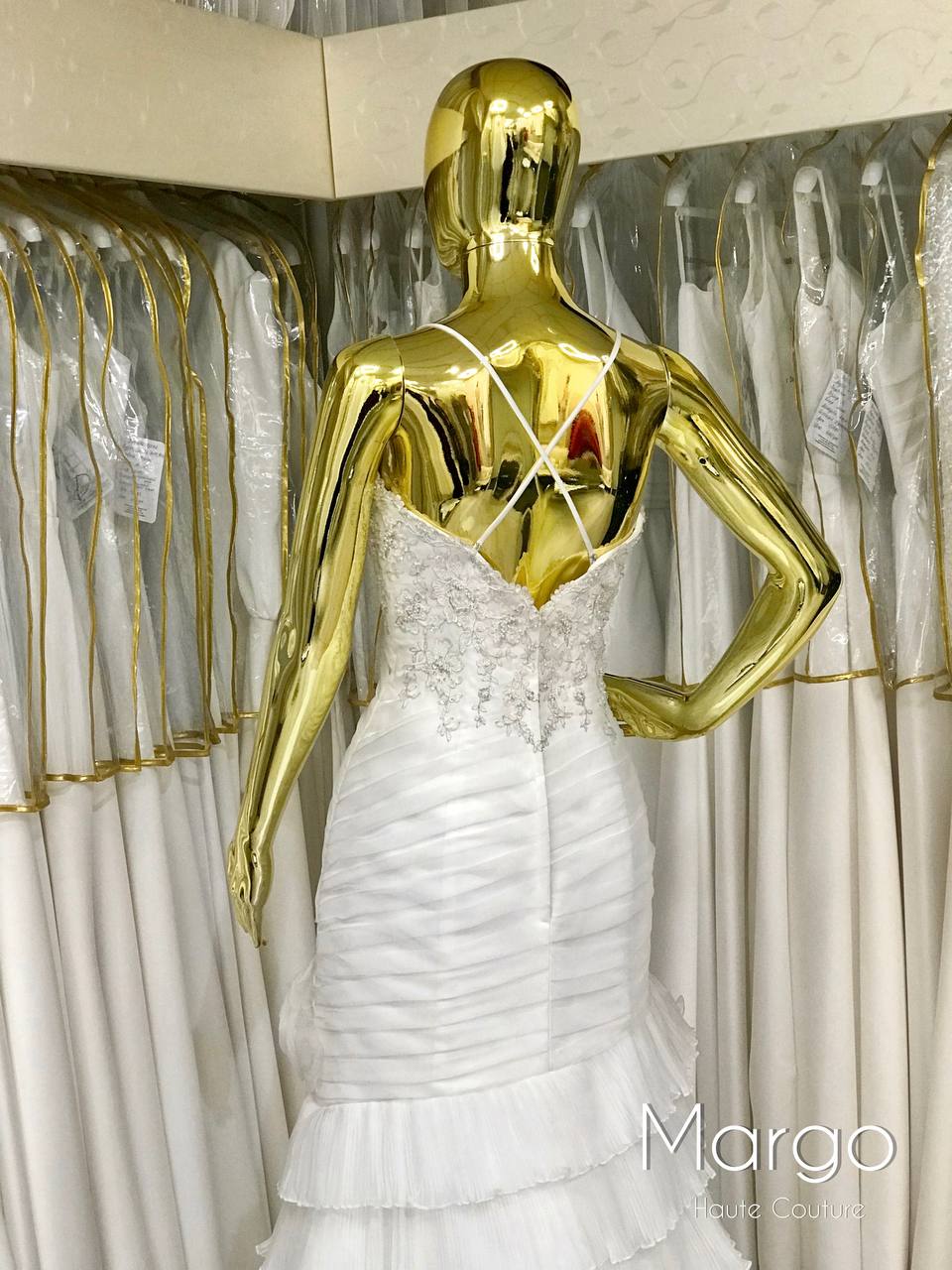 Легка, повітряна постать при вигляді якої перехоплює подих! Саме такий опис підійде нареченій у цій сукні. Делікатні ґудзики на спині та візерунок з намистин прикрашає топ а багатошарова спідниця зі шлейфом перетворює дівчину у справжню квітку.