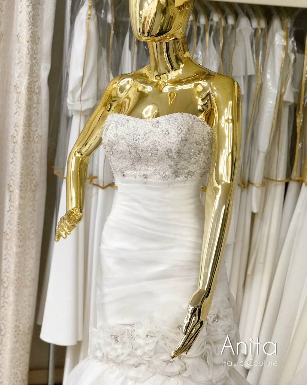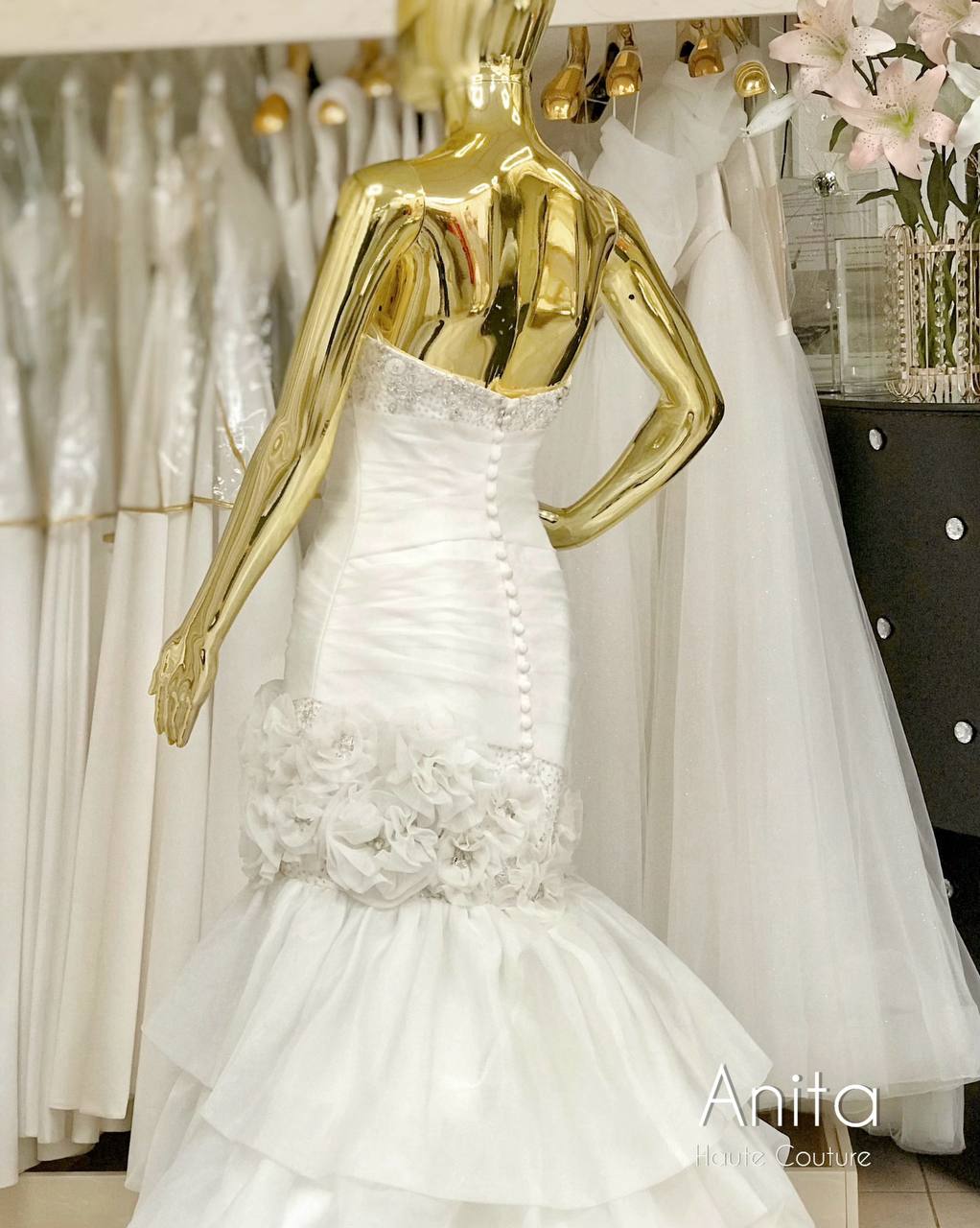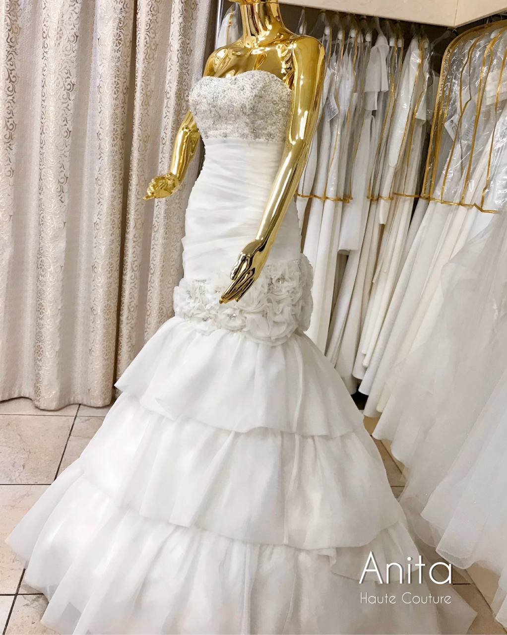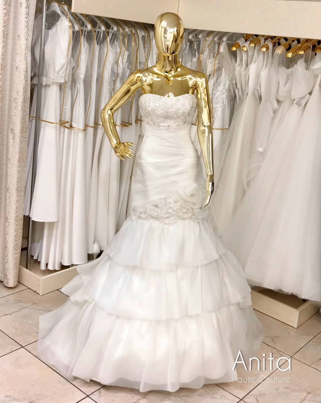 Сяйте на весіллі, як справжня королева! Неповторна модель «Anita» у стилі 'годе', що облягає, створена руками Кутюр'є для найвишуканішої нареченої. Волани з невагомої органзи, додають легкості, а розкішний квітковий декор, усипаний кристалами «Swarovski», надає неповторне сяйво. Зачаруйте всіх пишнотою, підкреслюючи свою витонченість та стиль!