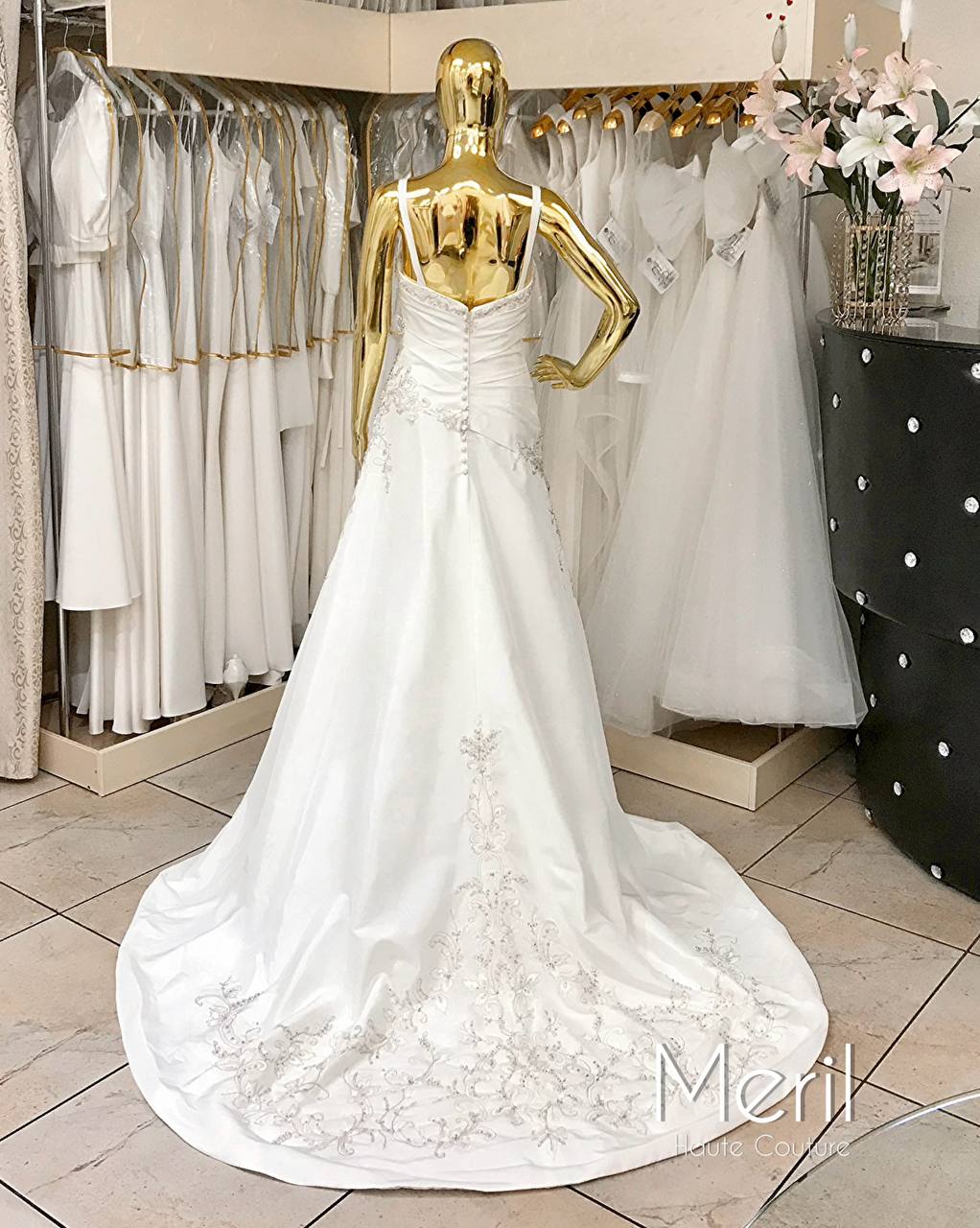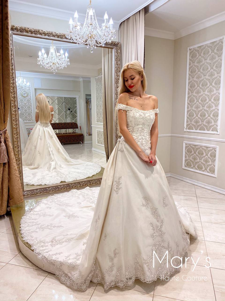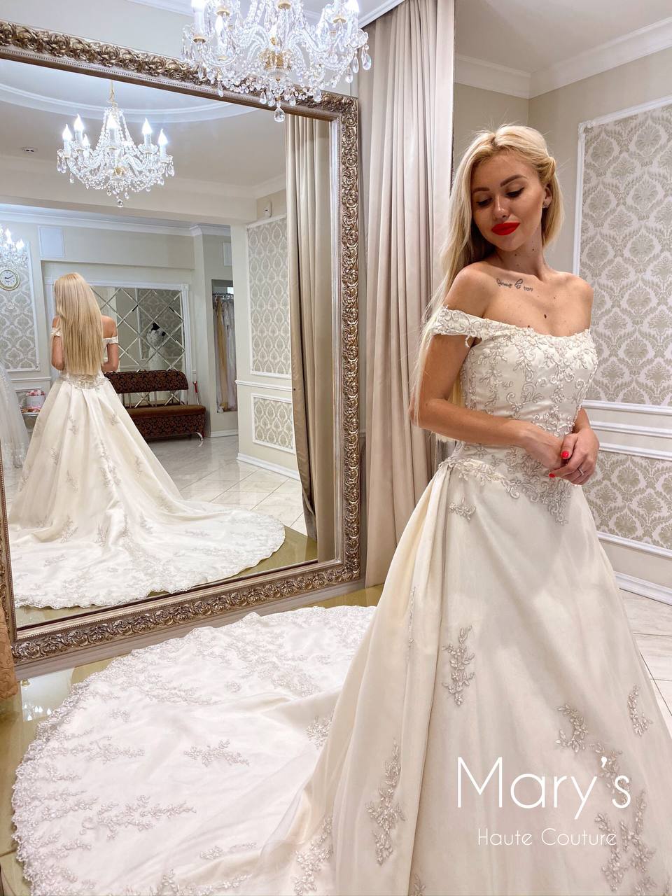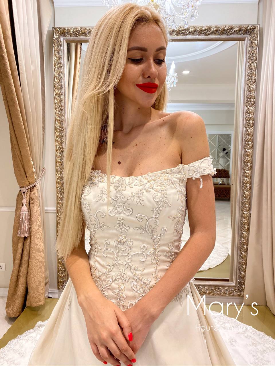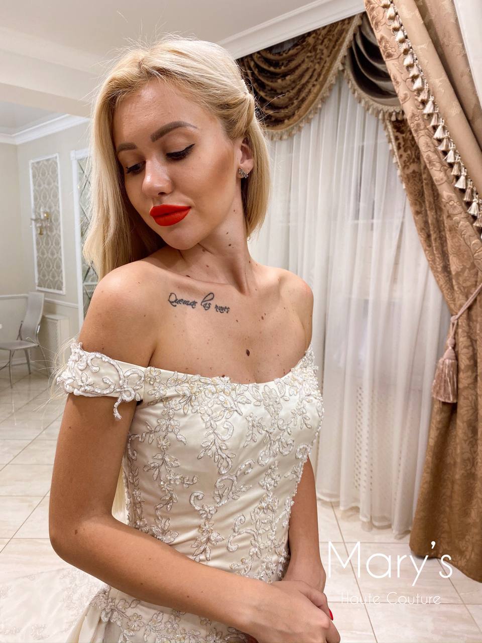 Неймовірна сукня-трансформер з величним пристібним шлейфом для розкішної фотосесії. Це саме та сукня, що підкреслить не тільки вашу жіночну осанку та спокусливу фігуру, а зробить Ваш особливий день по-справжньому королівським. Ніжно приспущені брителі додають образу соблазну та вигідно підкреслюють всю витонченість ключиці. А спідниця з довгим пристібним шлейфом прикрашена шикарною вишивкою ідеально завершуює образ та робить його незабутнім для всіх оточуючих.