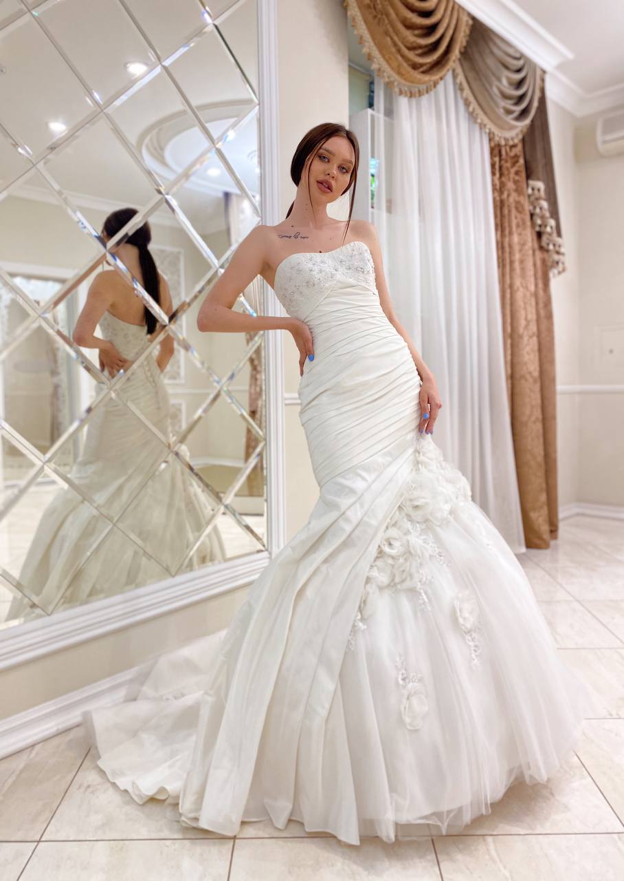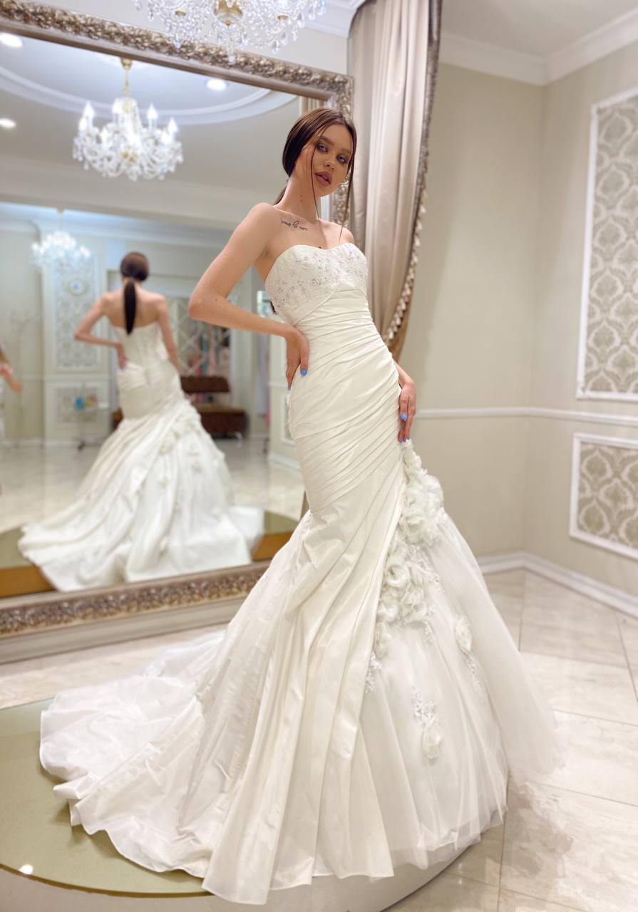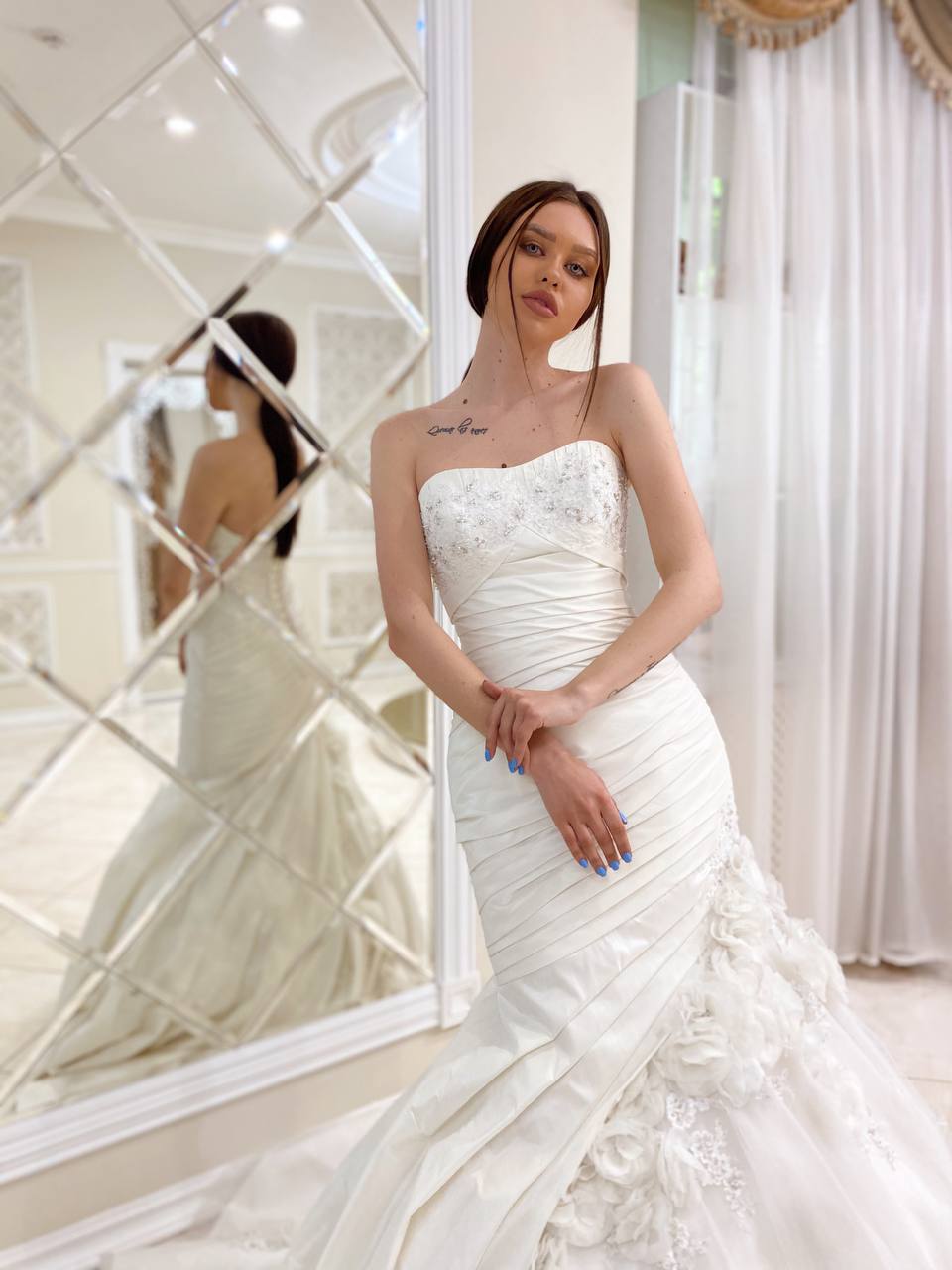 Подаруйте своєму весільному образу повітряну легкість і елегантність у сукні з органзи, що летить, від всесвітньо відомого бренду «Mori Lee». Облягаючий силует підкреслить красу вигинів фігури, а чашка-бюстьє у формі квітки додасть вишуканості та ніжності. Чарівність і витонченість у кожній лінії чекає на свою витончену Власницю.
