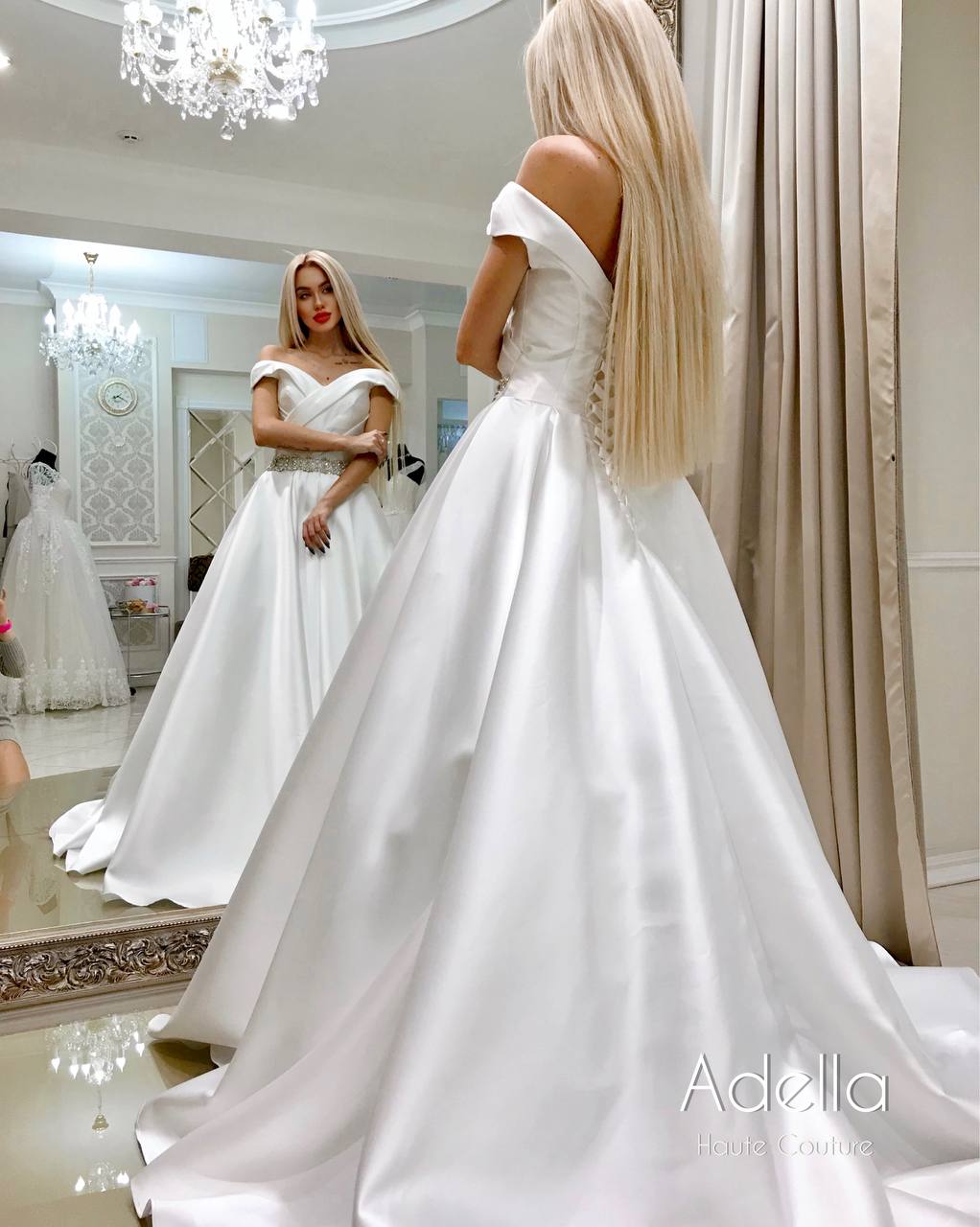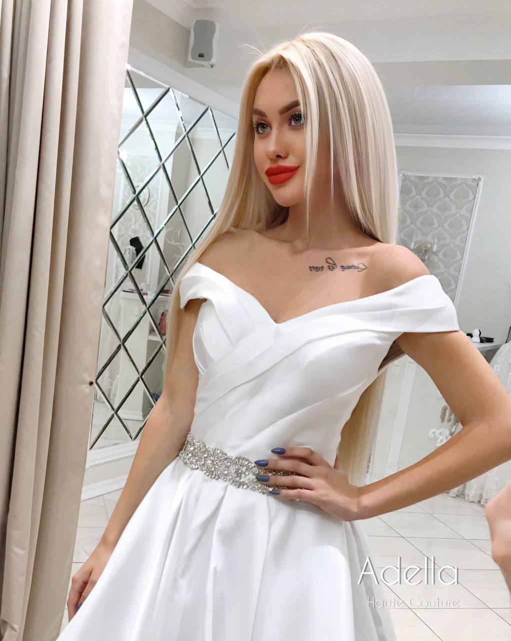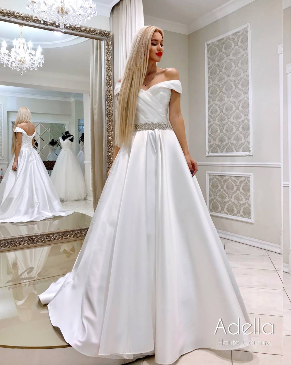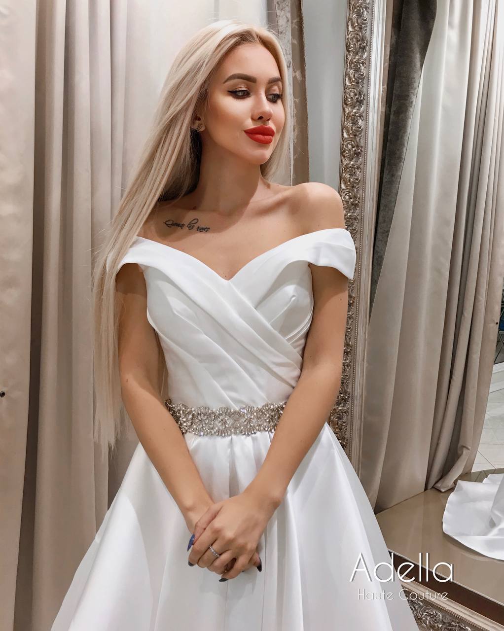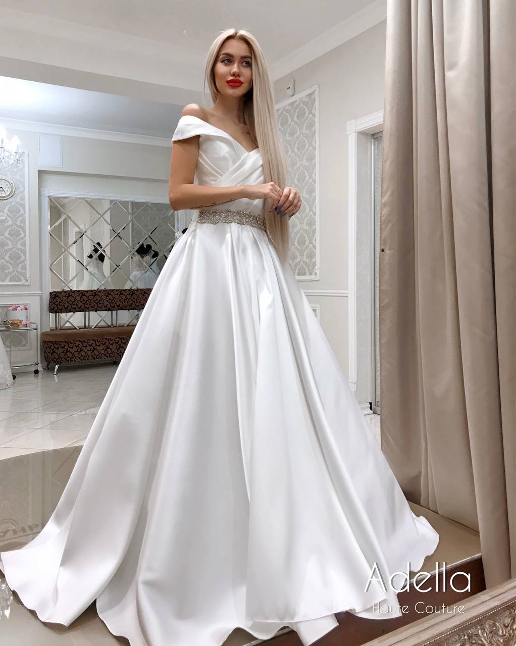 Наш відомий хіт «Adella» з неперевершеної тканини «мікадо». Приспущені плечики вигідно акцентують увагу на декольте, а розкішний пояс з каміння «Swarovski» підкреслює струнку талію. Ви закохаєтесь у цю сукню з першої примірки.
