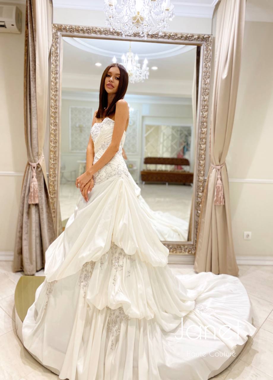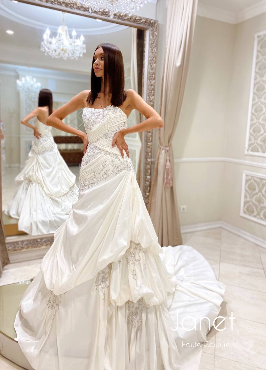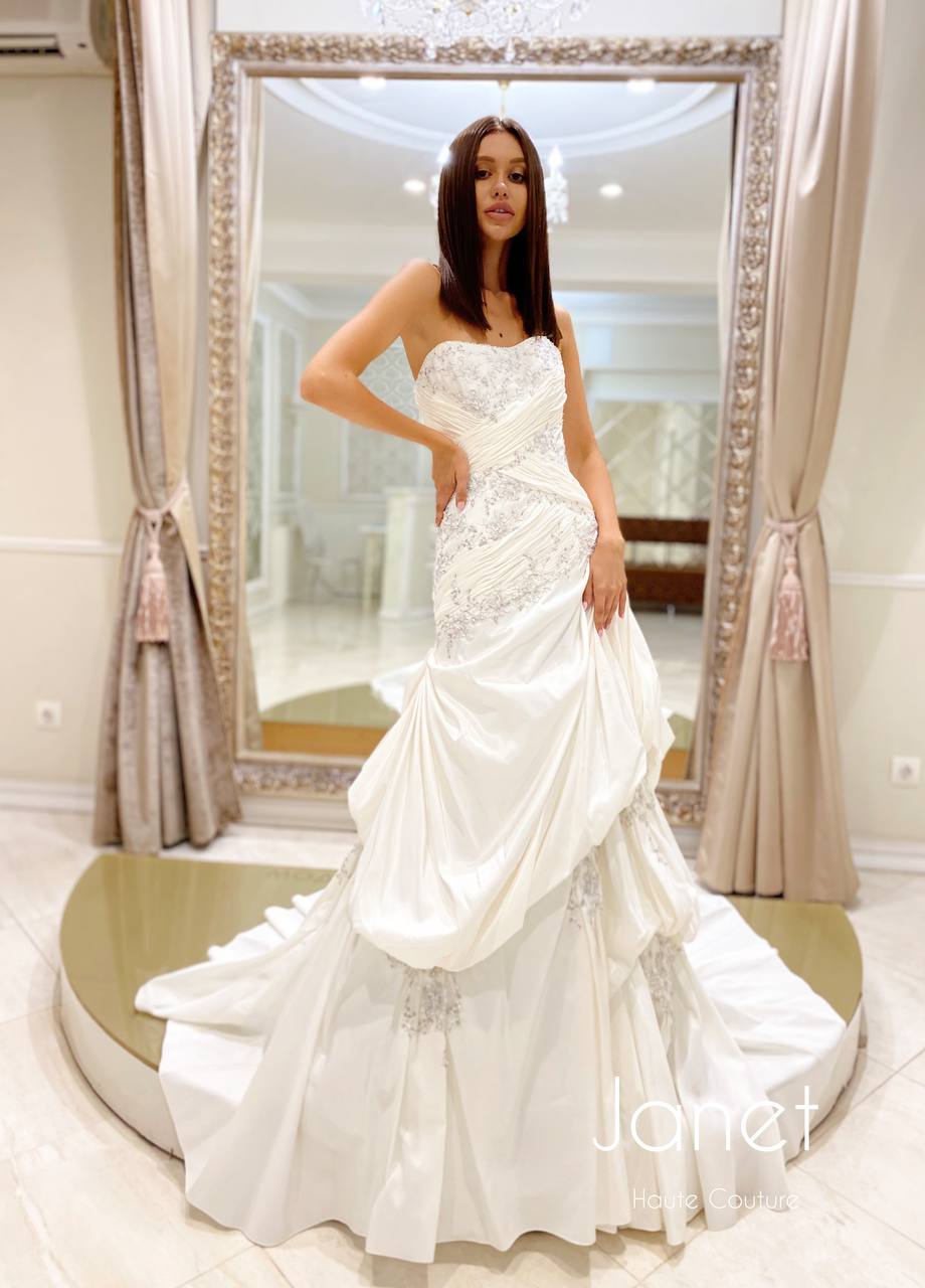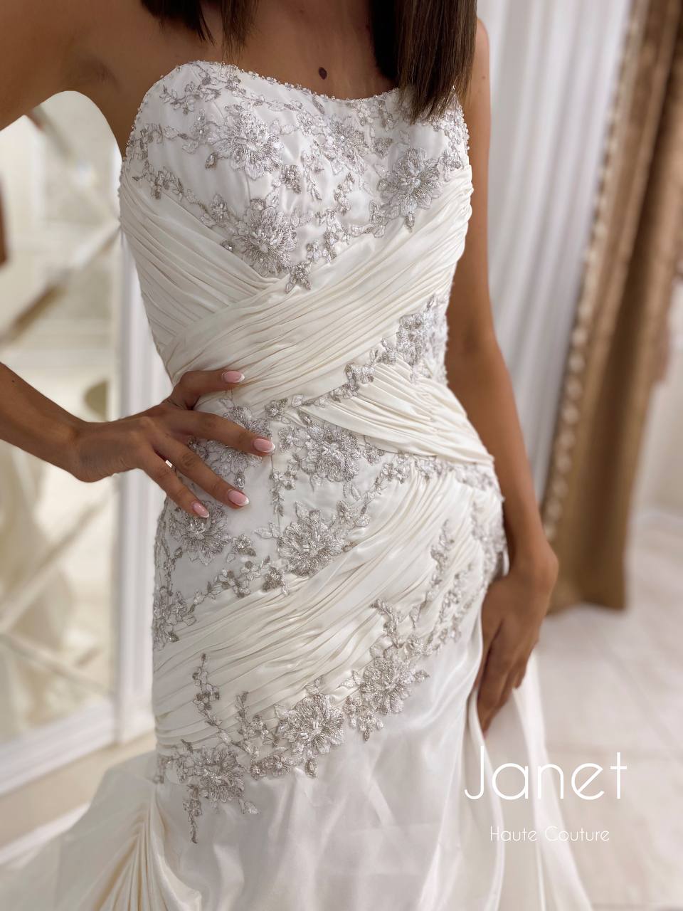 Хотіти виглядати як королева – природно, особливо коли вибираєш весільну сукню. А завжди популярний та бажаний силует рибки втілить цю мрію у реальність. Модель «Janet»підкреслить усі вигини вашого тіла і виставить їх лише у кращому світлі. Верх моделі покритий візерунками, вишитими бісером та паєтками, та багатошарова спідниця з фатину, зроблять Ваш образ неперевершеним.