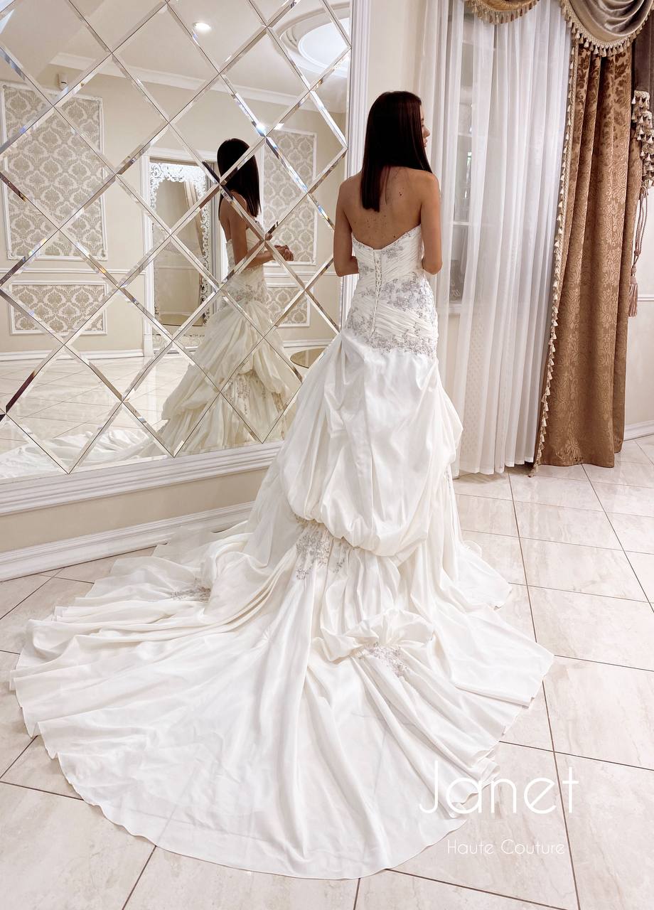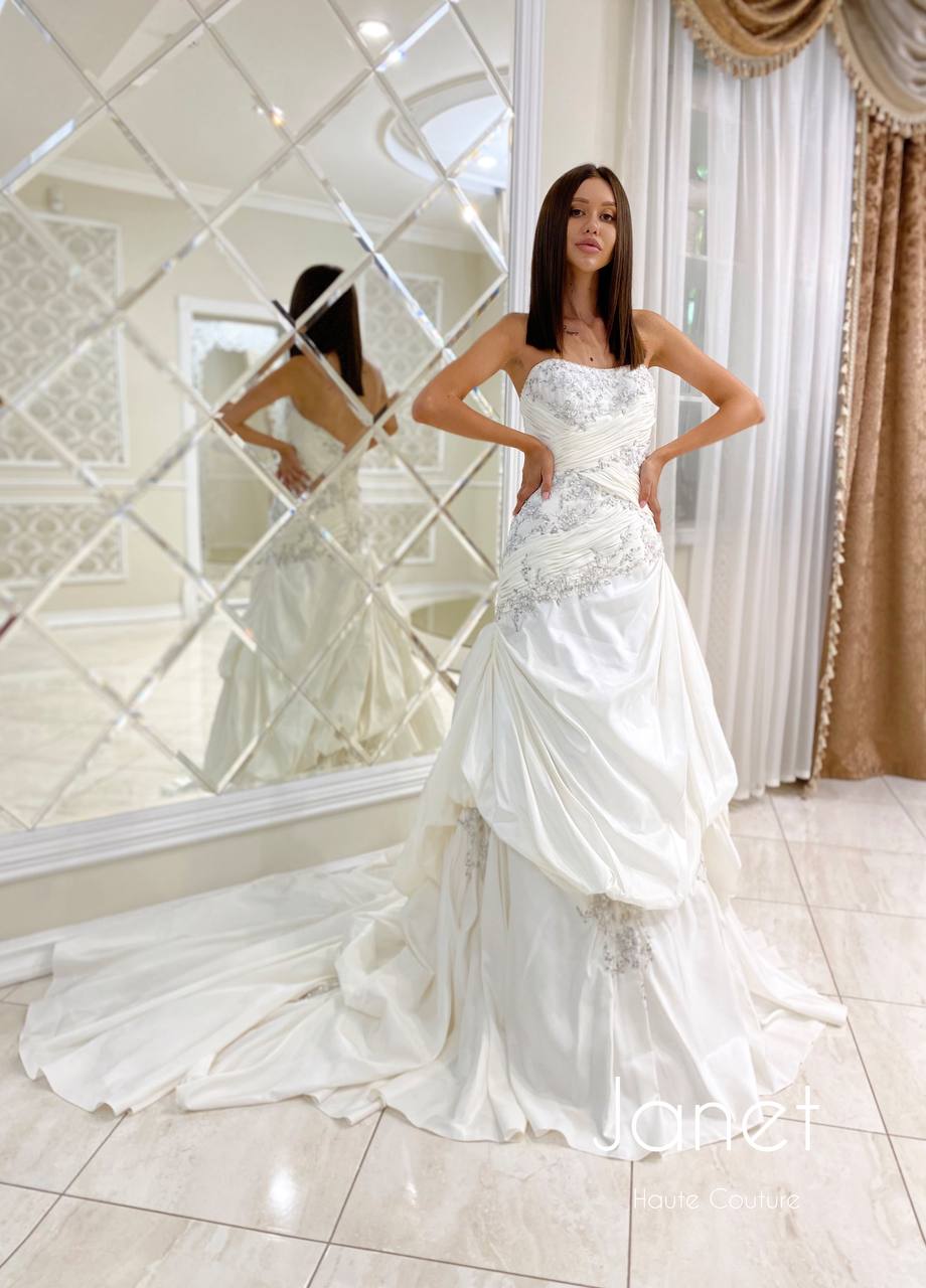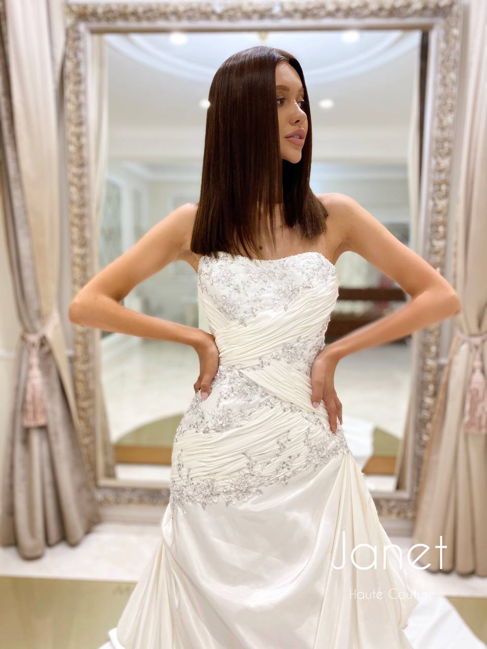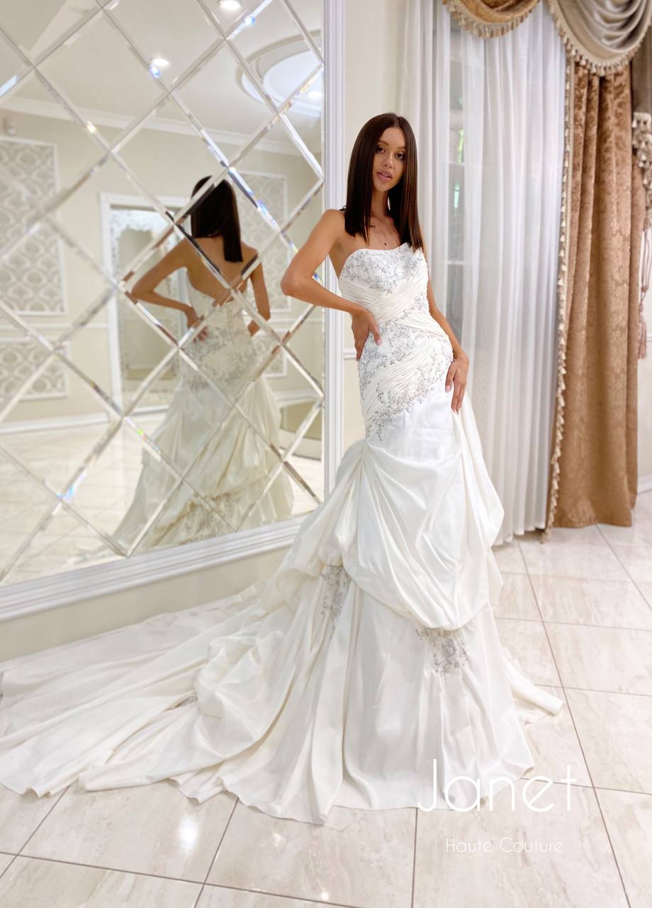 Хотіти виглядати як королева – природно, особливо коли вибираєш весільну сукню. А завжди популярний та бажаний силует рибки втілить цю мрію у реальність. Модель «Janet»підкреслить усі вигини вашого тіла і виставить їх лише у кращому світлі. Верх моделі покритий візерунками, вишитими бісером та паєтками, та багатошарова спідниця з фатину, зроблять Ваш образ неперевершеним.