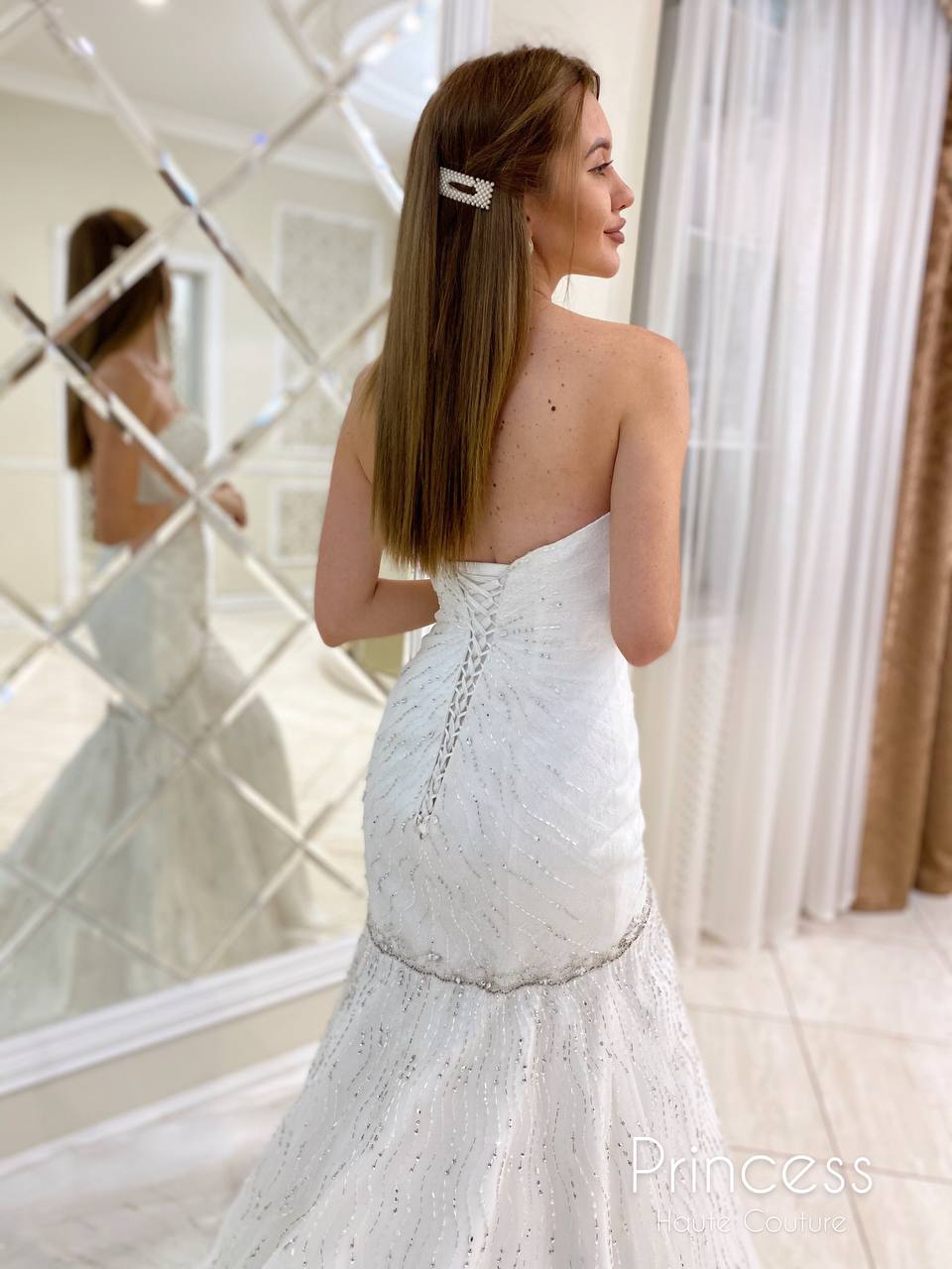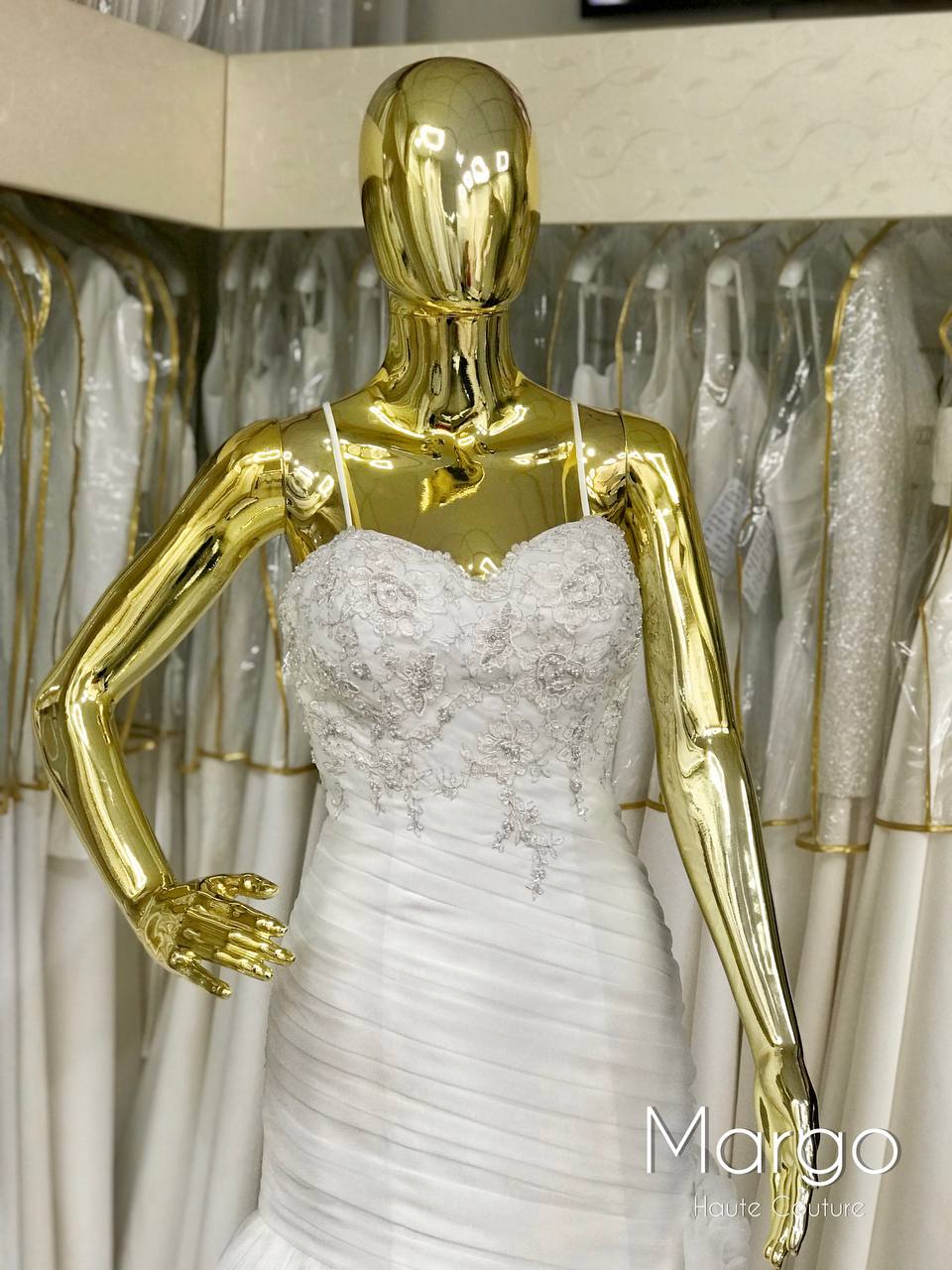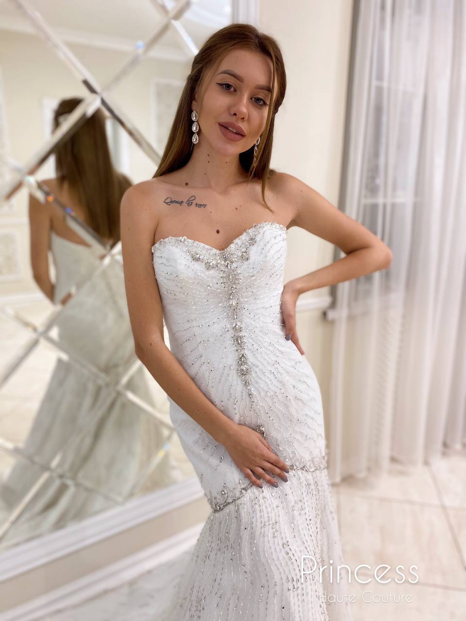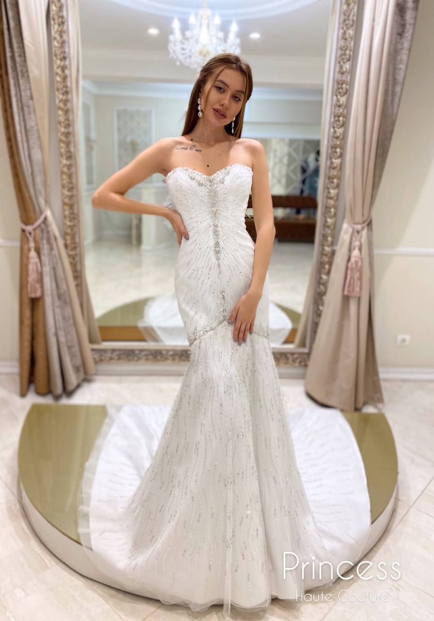Улюблені усіма весільноі сукні силуету «рибка» привертають увагу. Вони ідеальні для дівчат, які пишаються своєю фігурою і не бояться її підкреслювати. Спідниця ідеально підкреслить лінії фігури і грацію нареченої, а ліф прикрашений вишивкою з сяючими перлинами так і кричить о вишуканості Вашого смаку.