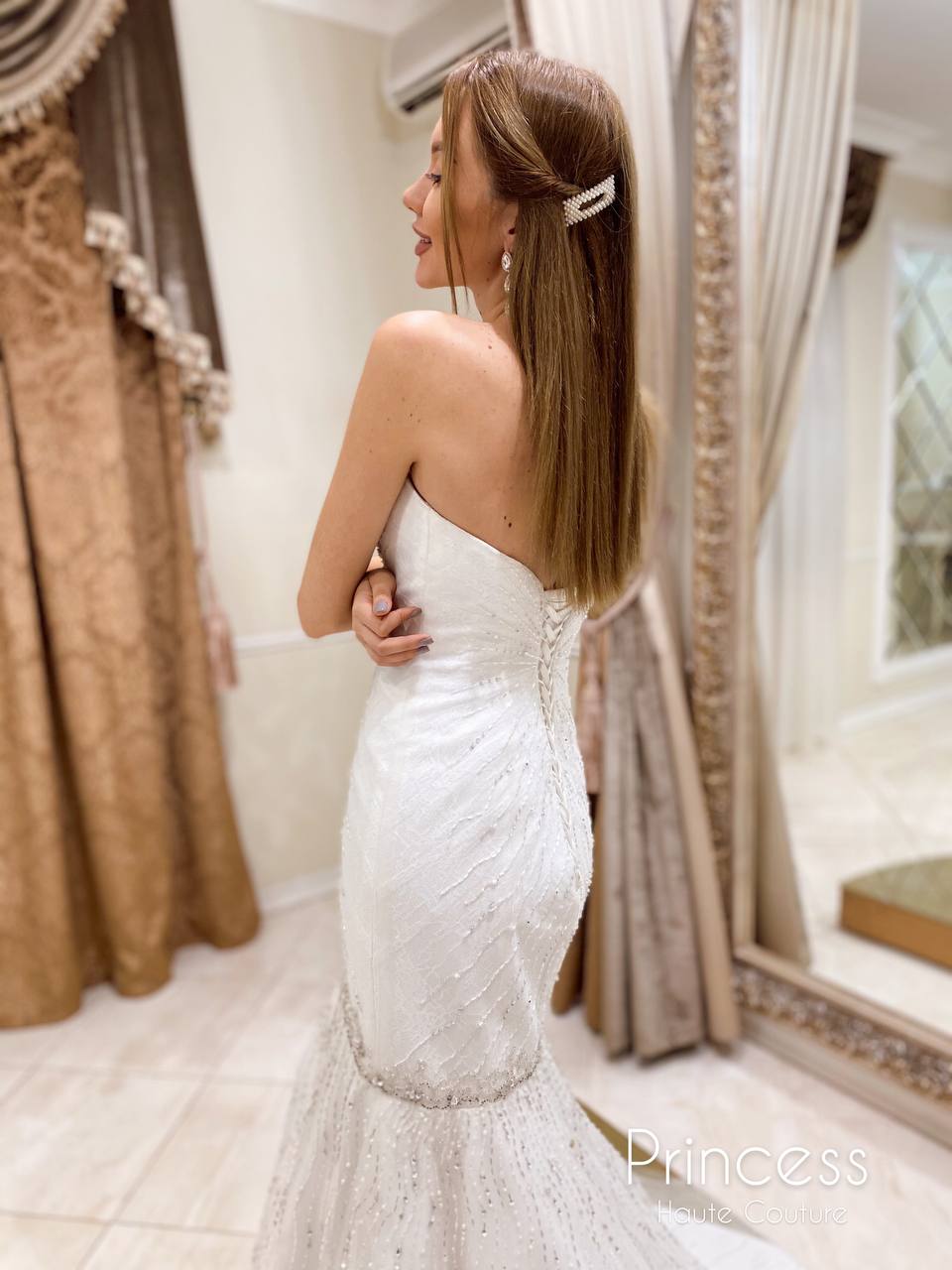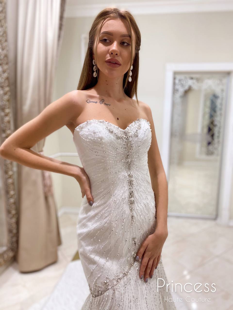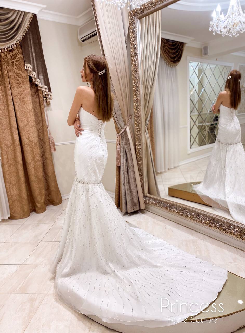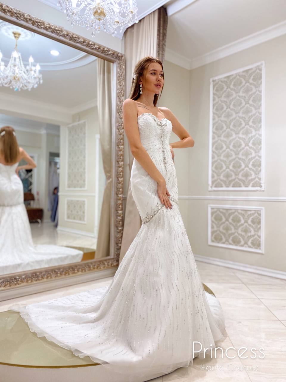 Улюблені усіма весільноі сукні силуету «рибка» привертають увагу. Вони ідеальні для дівчат, які пишаються своєю фігурою і не бояться її підкреслювати. Спідниця ідеально підкреслить лінії фігури і грацію нареченої, а ліф прикрашений вишивкою з сяючими перлинами так і кричить о вишуканості Вашого смаку.