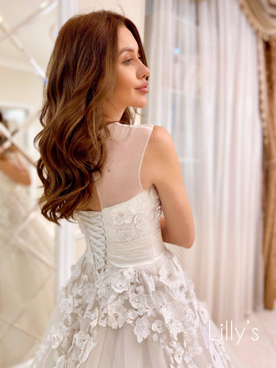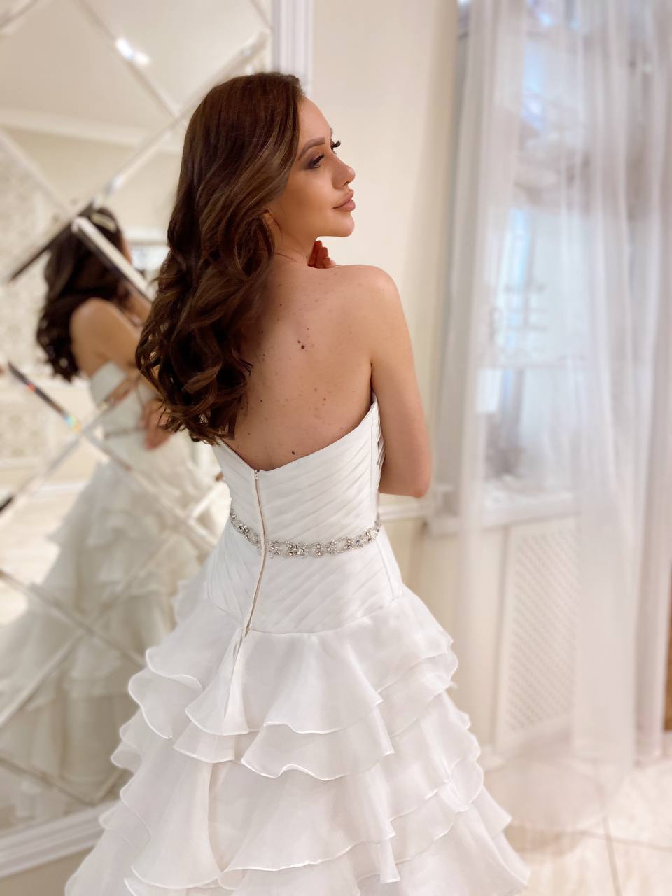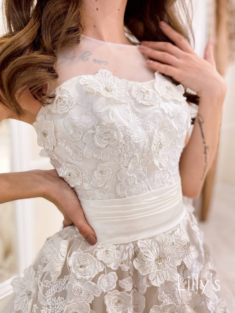 Чарівність у кожному русі! Наша коротенька весільна сукня з повітряною спідницею з пелюсток органзи створена для грайливих наречених. Легкість і ніжність тканини надають образу легкість, а спідниця, немов пелюстки квітів, додає неймовірну грайливість.