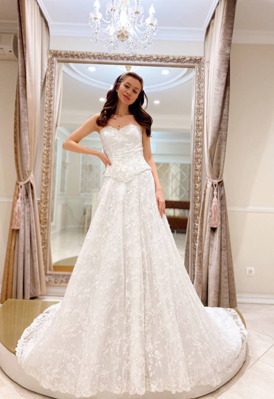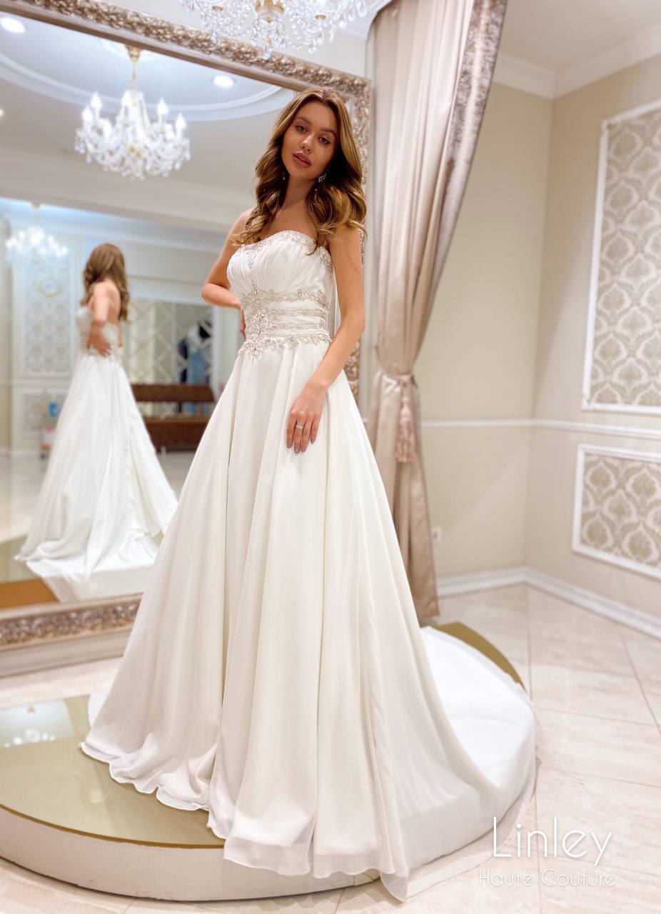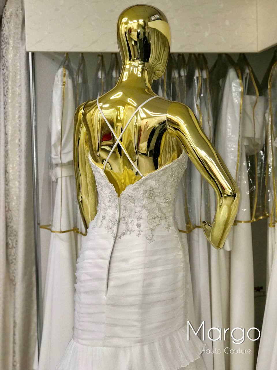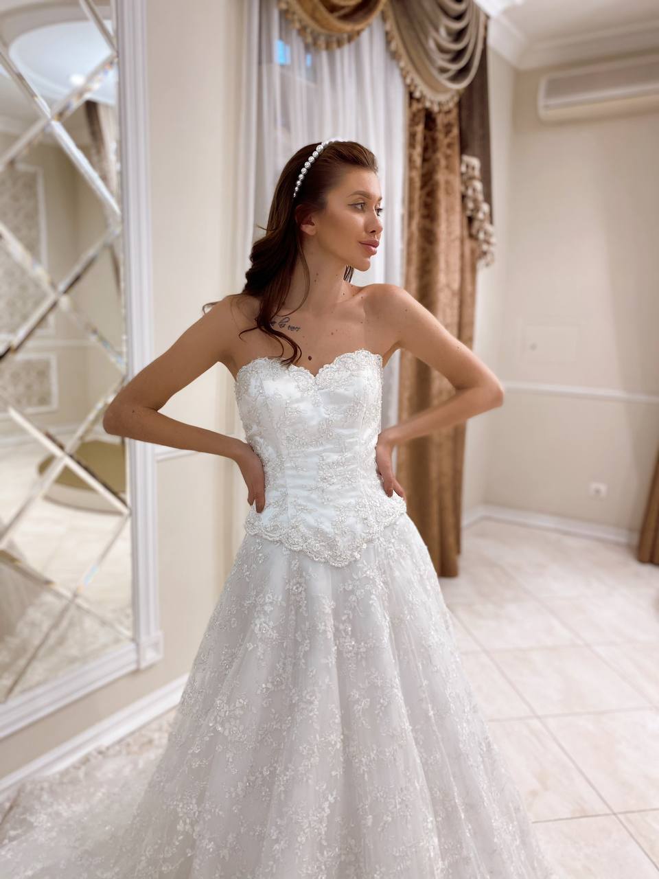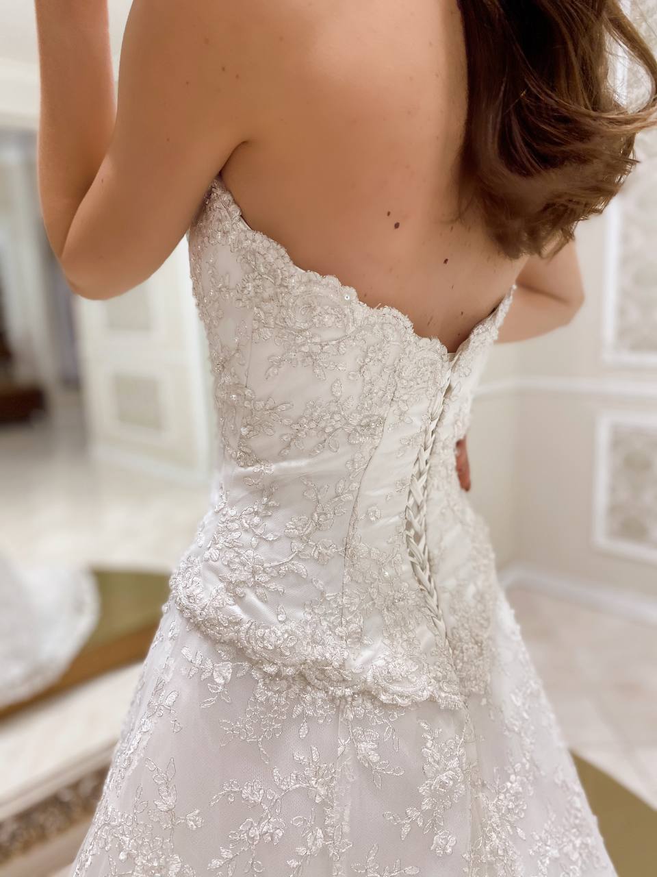 Сукня в якій кожна дівчина буде неперевершеною. Вишукане мереживо на спині у формі «метелика» з рядом маленьких перламутрових гудзиків. Легкий, повітряний шлейф та корсет «серце» підкорять будь кого. Саме тому ця сукня чекає свою єдину власницю.