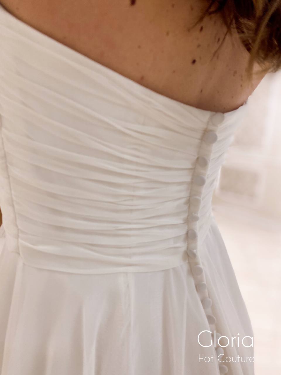 Легкість та вишуканість у кожній деталі! Наша коротка весільна сукня з шифону з елегантною чашкою бюстьє покликана підкреслити вашу жіночність. Дайте своєму образу легкість та шарм, щоб цей особливий момент був неймовірним.