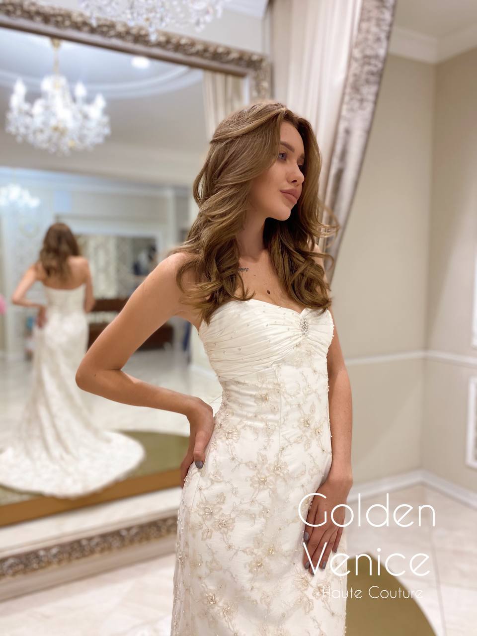 «Goldi» - мінімалізм та елегантність. Короткий силует підкреслить вашу ніжність, а золота вишивка додасть вам розкоші та блиску. Сяйте яскраво у свій особливий день!